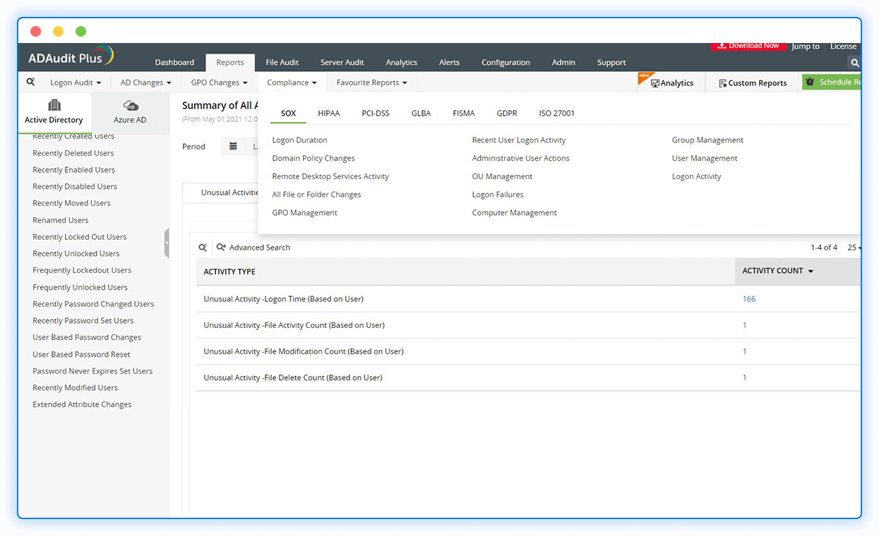 Meet regulatory mandates Streamline compliance with multiple regulatory standards by maintaining detailed audit reports on all AD modifications, including AD lockouts.