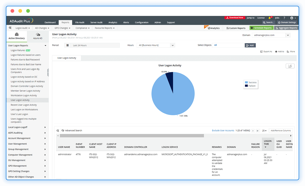 Track logon activity across your Active Directory (AD), identify failed logons, and investigate the reason for failure with comprehensive reports.