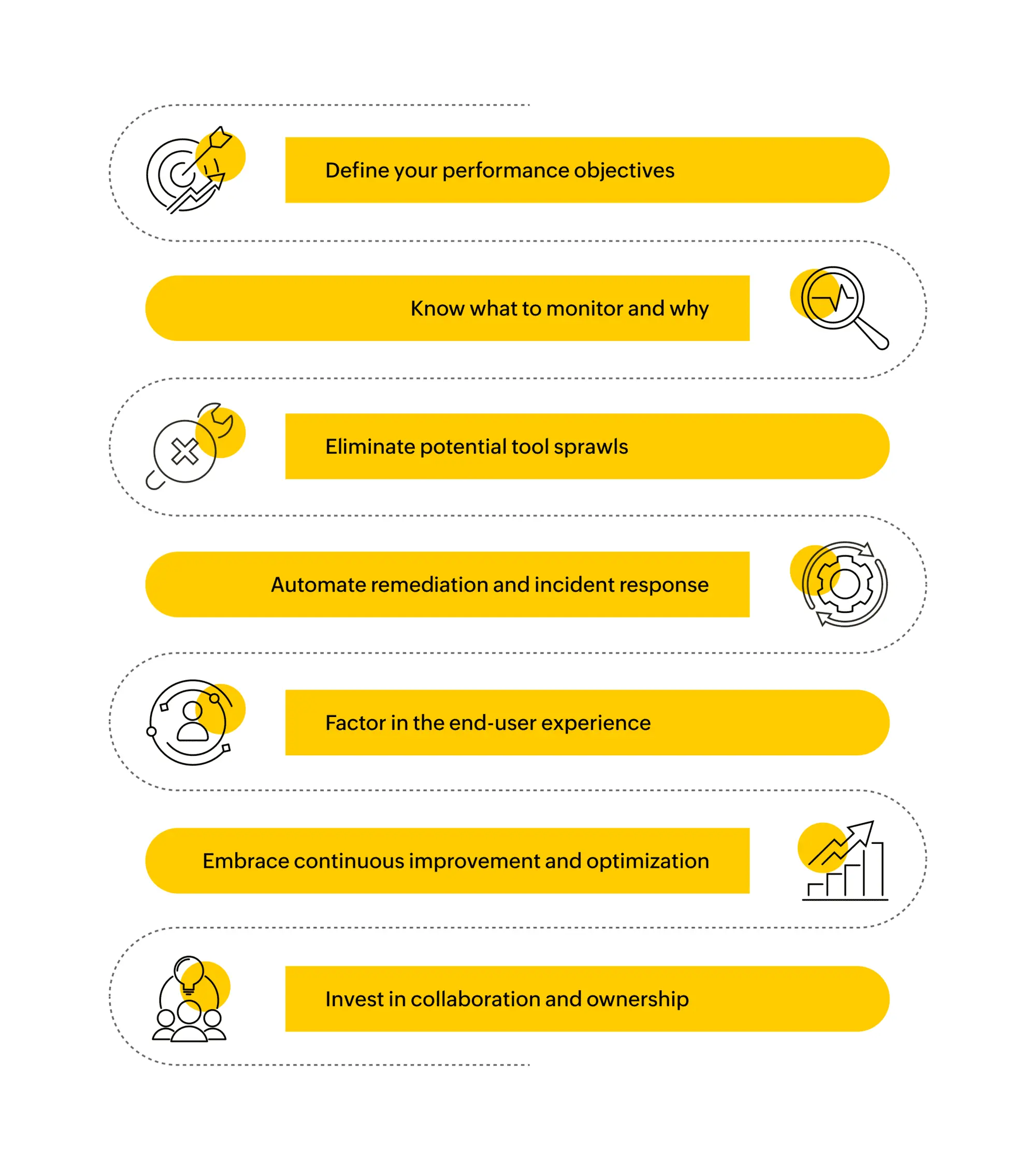 Business applications, much like the businesses they support, must undergo constant evolution to navigate new challenges effectively and capitalize on emerging opportunities. Engaging in the continual upgrade and optimization of both applications and their underlying infrastructure and services becomes paramount to staying agile and responsive. Application monitoring is not a one-time task, but an ongoing process that demands adaptability and customization. Some of the best practices in application performance monitoring include: