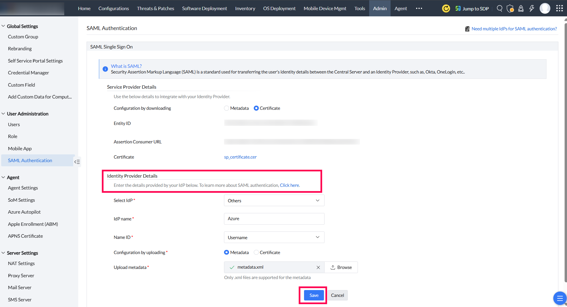 26.  In the Central Server web console, under Identity Provider Details, choose Others as IdP. Provide a suitable name for the IdP, and choose E-mail ID as Name ID. Next, select Metadata and upload the downloaded metadata file in step 21. Click Save.
