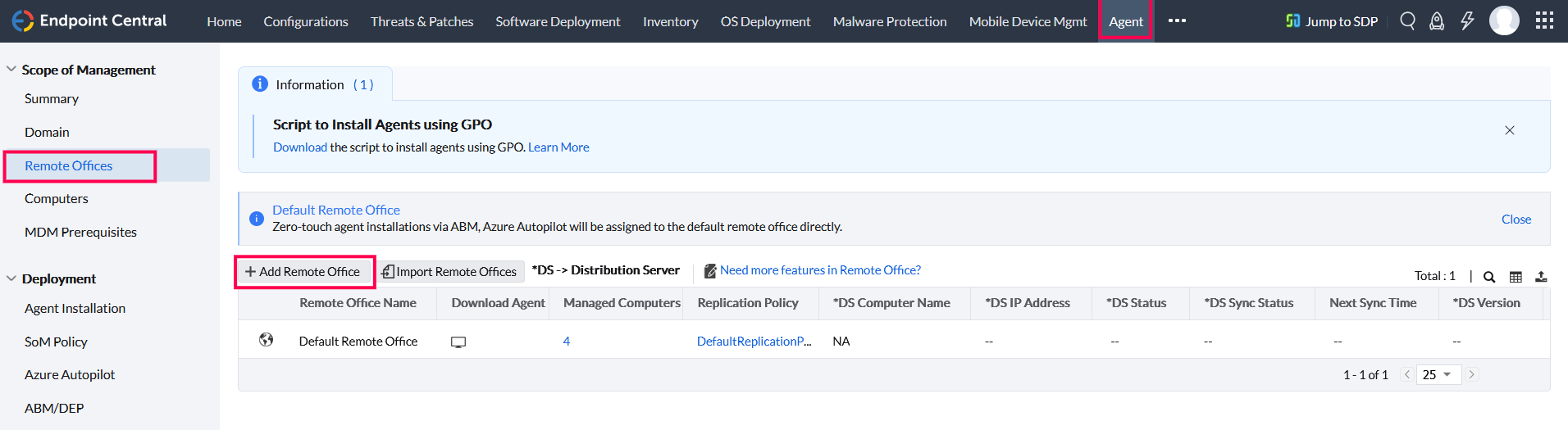 Setting up an AD connector in Endpoint Central cloud has two basic requirements. The first step is to create a remote office and set up a distribution server.