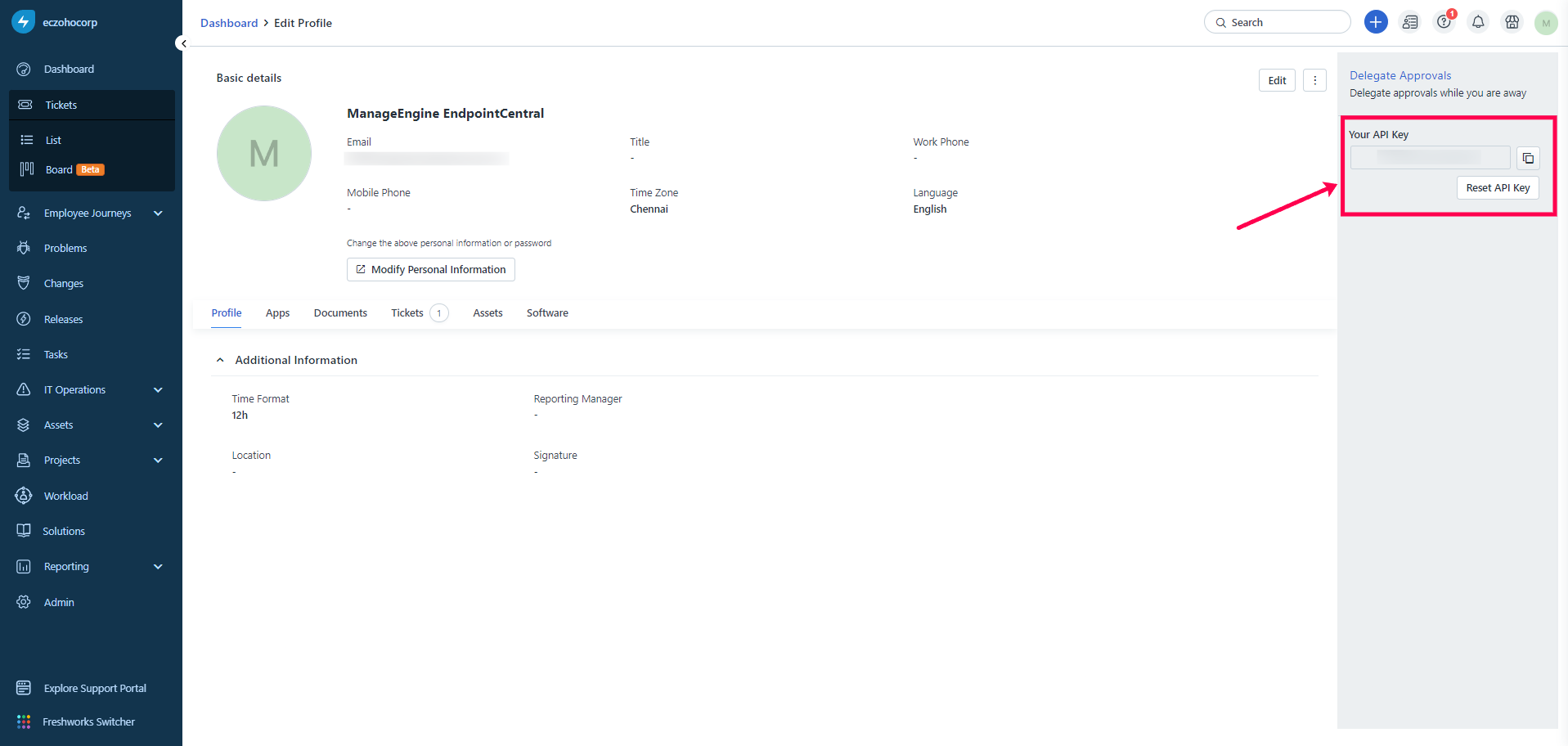 - To get the Freshservice API key, navigate to user profile > profile settings.