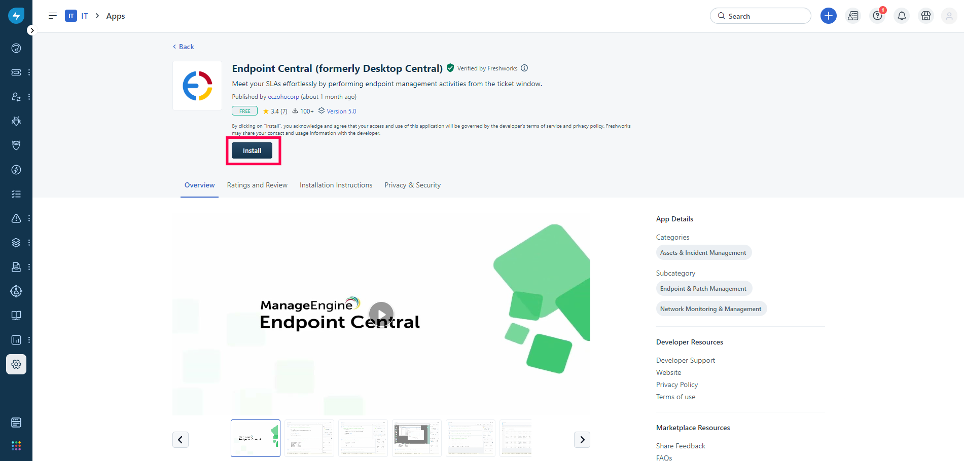- Log in to your Freshservice console, navigate to the Marketplace, and search for Endpoint Central.