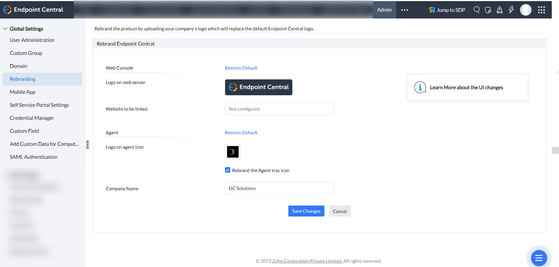 To rebrand, navigate to Agent > Global Settings > Rebranding and modify the logo and details on the page.