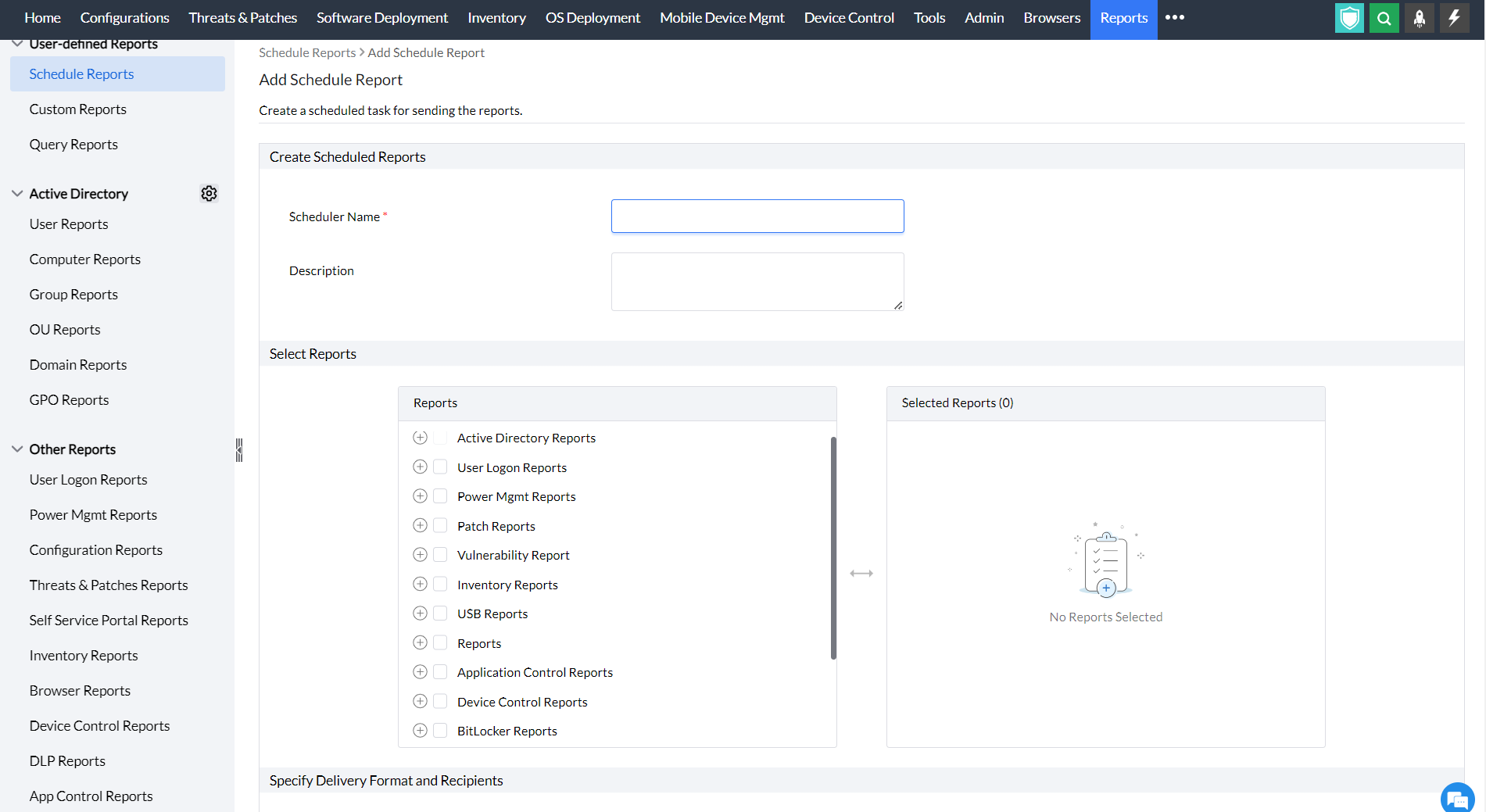 Scheduled reports is a feature in Endpoint Central that helps you to receive predefined reports, query reports and custom reports in specific formats like CSV, XLS and PDF. By using this feature, you do not have to go to the Endpoint Central web console and individually view reports. Instead, you can simply use this feature for the reports to be sent to you via mail at scheduled times. These reports are automatically scheduled and compiled and can also be sent to multiple people at once by configuring the settings.
