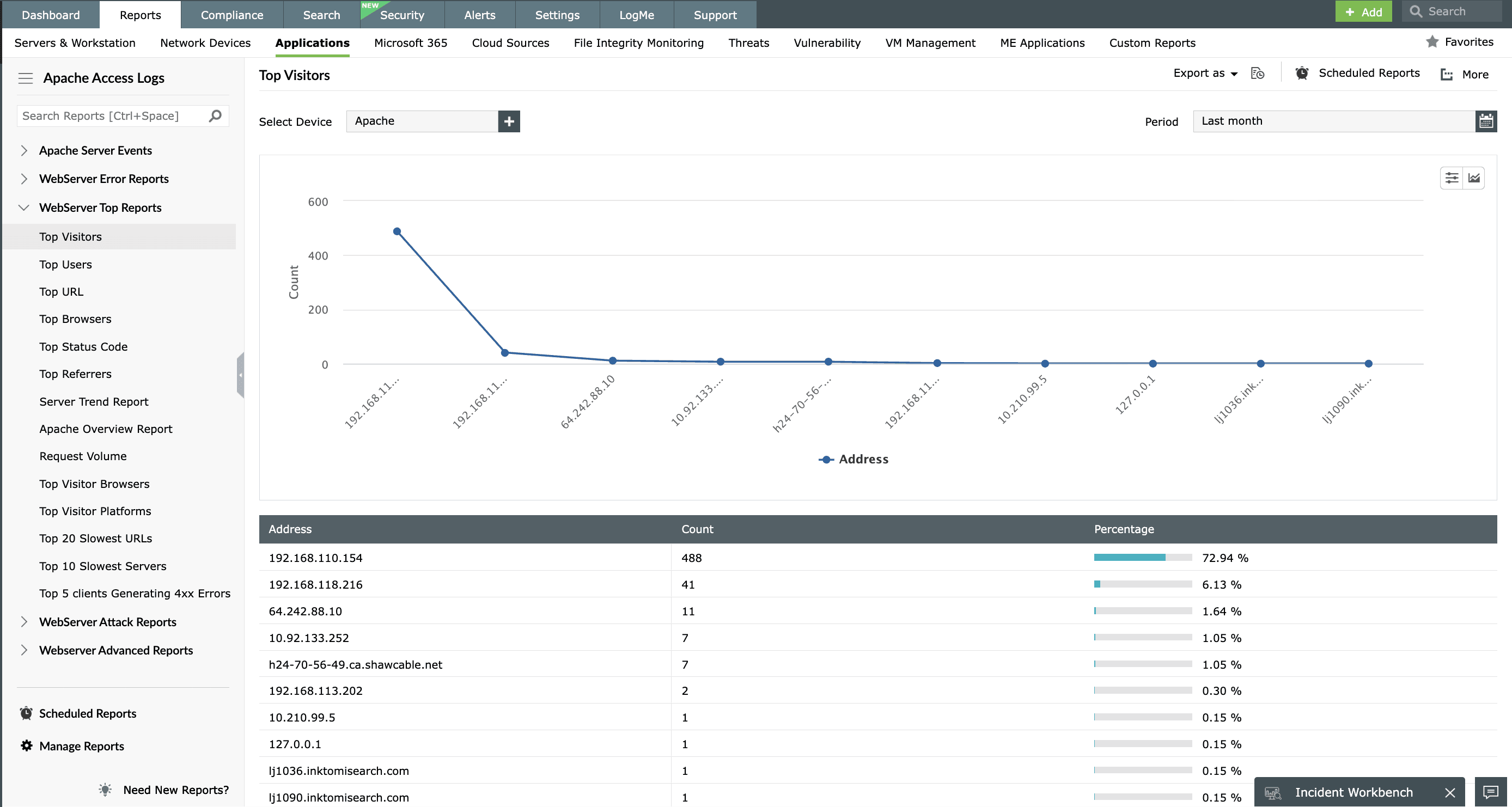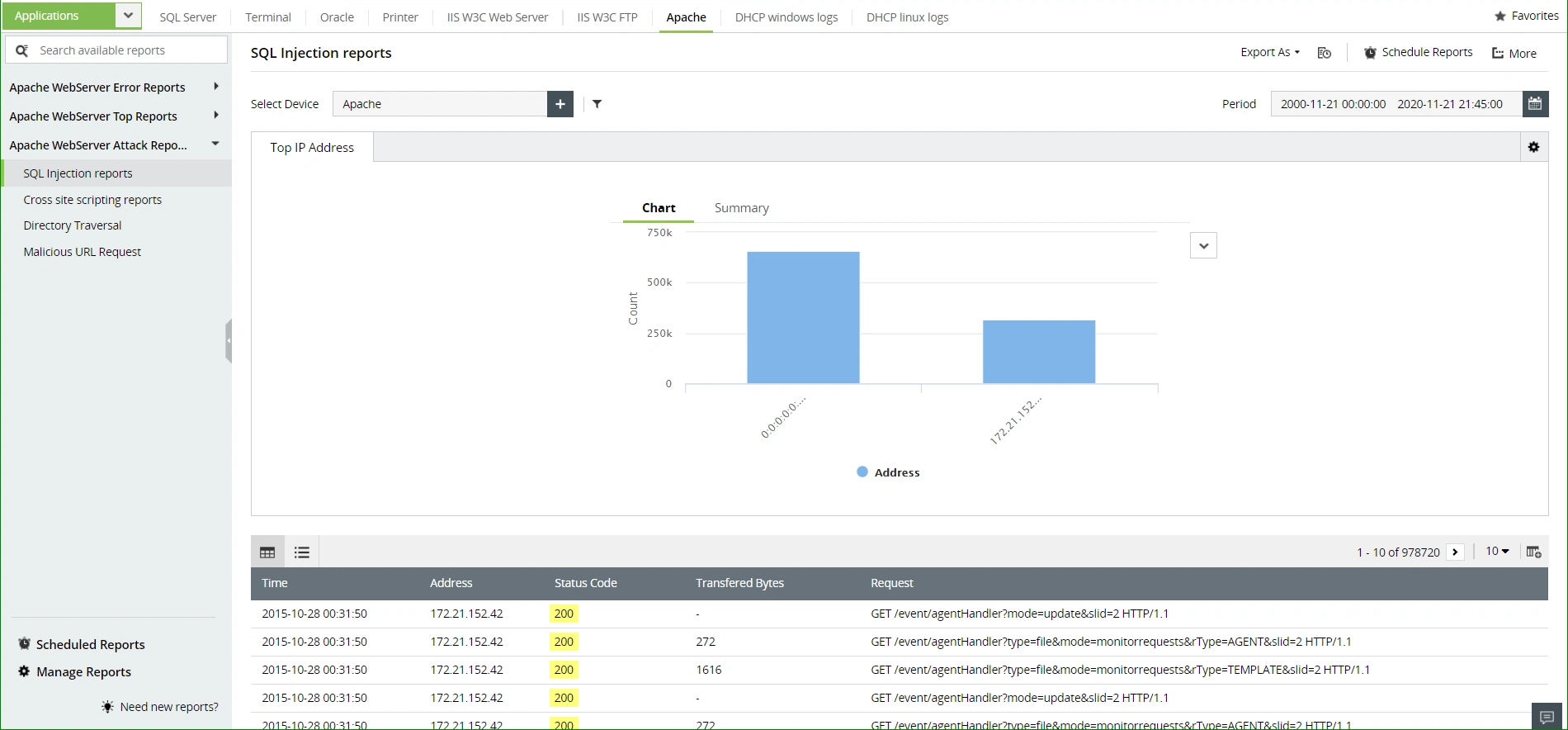- Gain deep insights into your Apache server activity with the help of predefined intuitive reports. This helps you uncover suspicious usage patterns.