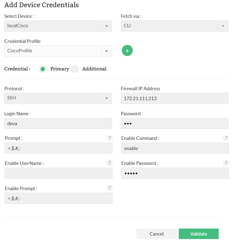 Additional - certain parameters usually take standard values. All such parameters have been classified under 'Secondary Info'. Port, login prompt, enable user prompt, password prompt, enable password prompt values are usually assigned with certain Standard Values by default. Such standard values have been filled for these parameters. Most of the devices would work well with these values and you need not edit these details unless you want to provide different set of details.
