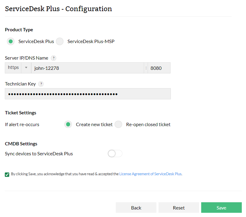 - Provide Server IP/ DNS Name, Port Number and paste the API key (Technician Key), copied from SDP UI.
