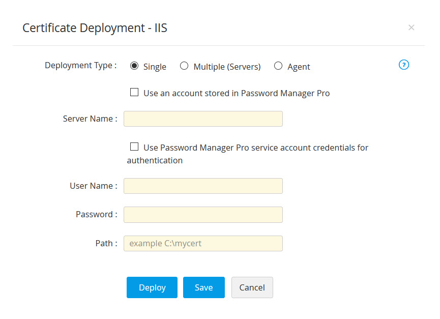 In general, SSL certificates procured from Certificate Authorities (CAs) are stored in a repository and then manually deployed on appropriate target systems. Password Manager Pro deploys the certificates from the repository on the correct target systems automatically. You can use Password Manager Pro to deploy the certificates on the various systems individually, or in bulk, based on your requirements. Also, you can use the Key Manager Plus agent to deploy certificates on servers that reside in demilitarized zones outside of the domain where the Password Manager Pro server is present.