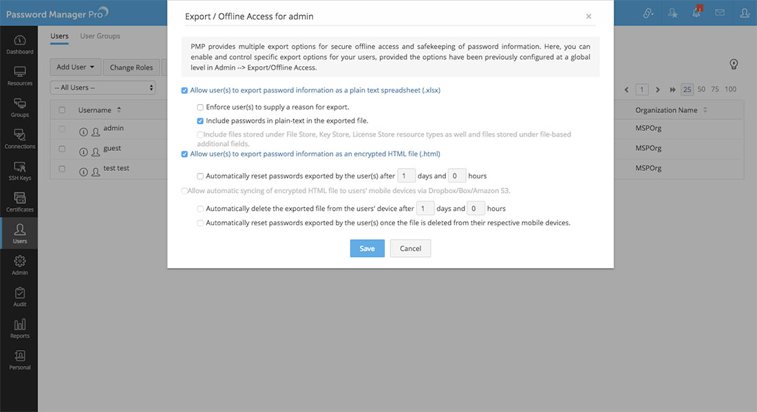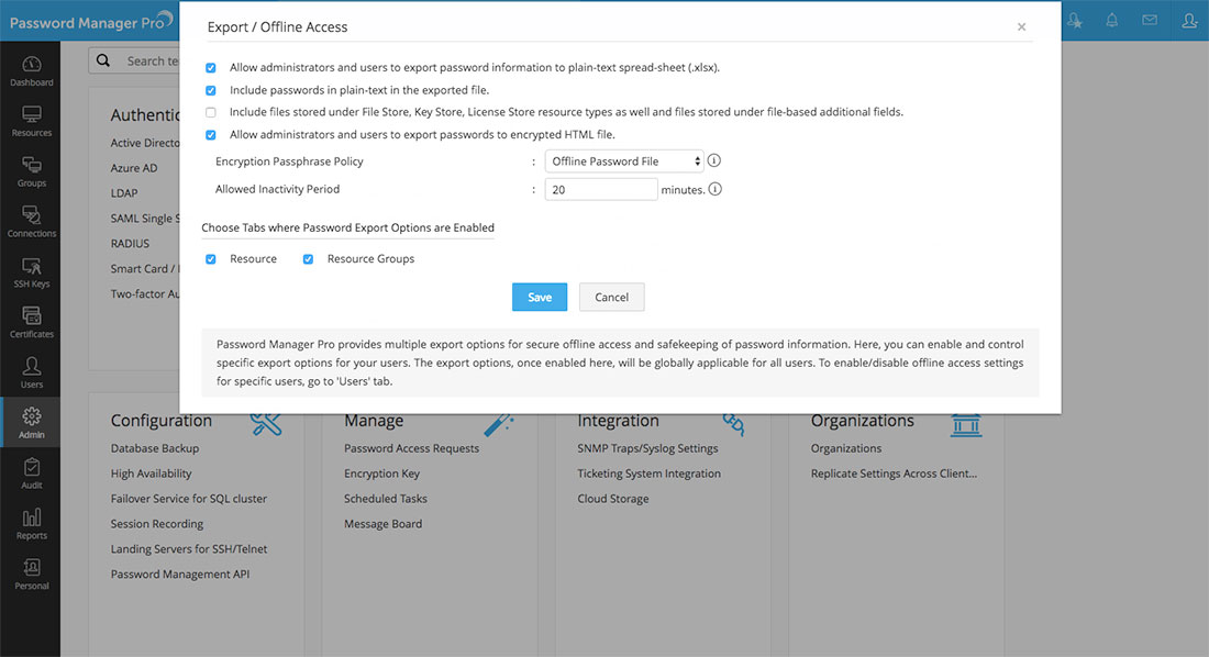 In both the above options, you can export the resources, accounts and passwords for offline access. Administrators can decide which option should be used in their organization. In addition, the export can be enabled or disabled for specific users or user groups based on requirements. However, before configuring user-specific settings for export, the feature should first be enabled globally for all the users.