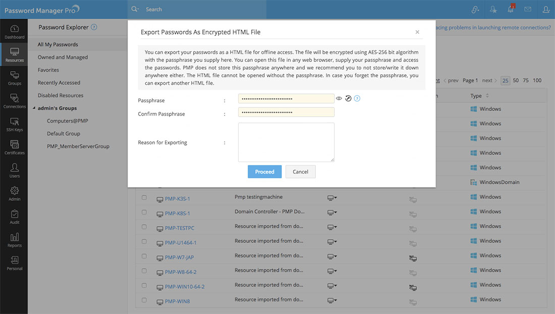 - You can export passwords as an encrypted HTML file so as to view the passwords even when there is no internet connection. This offline option is very secure. The contents of the file will be encrypted using AES-256 bit algorithm with the passphrase that the users will be required to provide prior to exporting the passwords. Password Manager Pro does not store this passphrase anywhere and we recommend you to not store / write it down anywhere either. The HTML file cannot be opened without the passphrase. In case you forget the passphrase, you can export another HTML file. Your passphrase could be up to 32 characters long, including blank spaces.