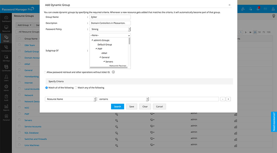 2. When you create a nested resource group, by default, the name of the root node of the tree will have your login name. For example, if you are logging into Password Manager Pro as "admin", the name of the root node will be "Admin's Group". If you want to have a different name for the root node, you can edit it.