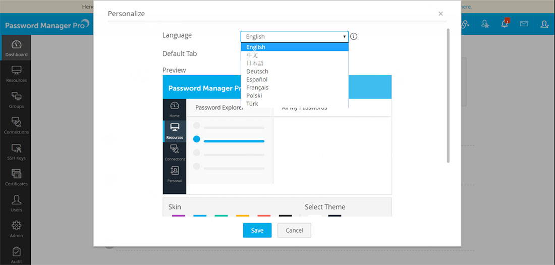 - From the Language drop-down menu, you can choose a language for the web interface. Password Manager Pro will then be available in the chosen language after you save the changes.