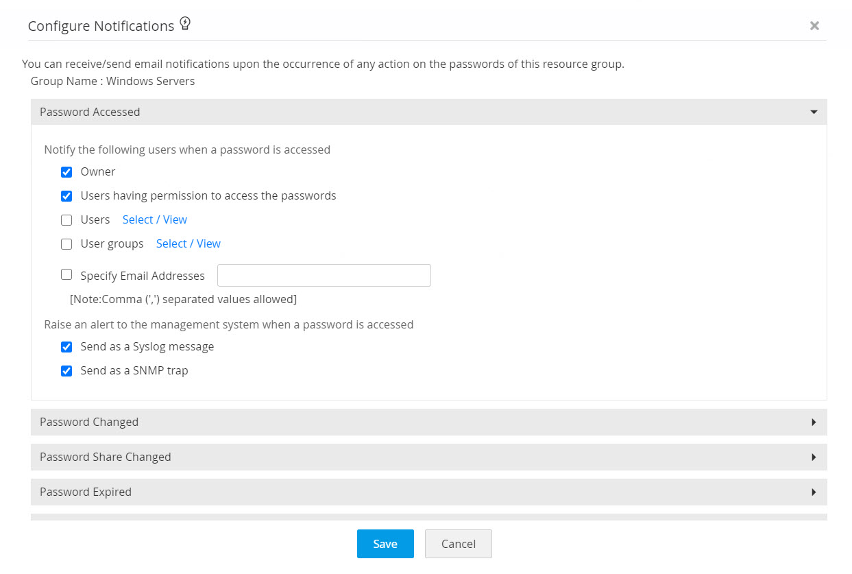 2. Password-oriented: To generate password-related SNMP traps and syslog messages, navigate to Groups >> Actions (of desired group) >> Configure Notifications. Select the required options in the window that appears and click Save.