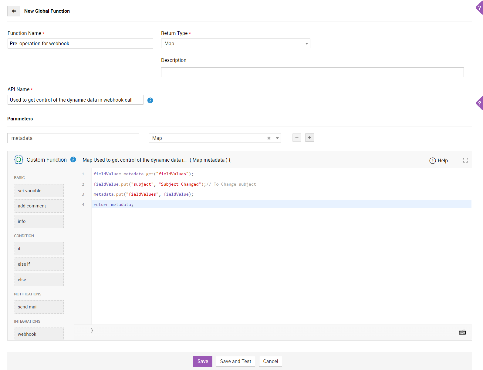 A webhook can be created using the global function of DELUGE. Using Deluge scripting, you can build custom functions that can manipulate data within ServiceDesk Plus MSP and other external applications.