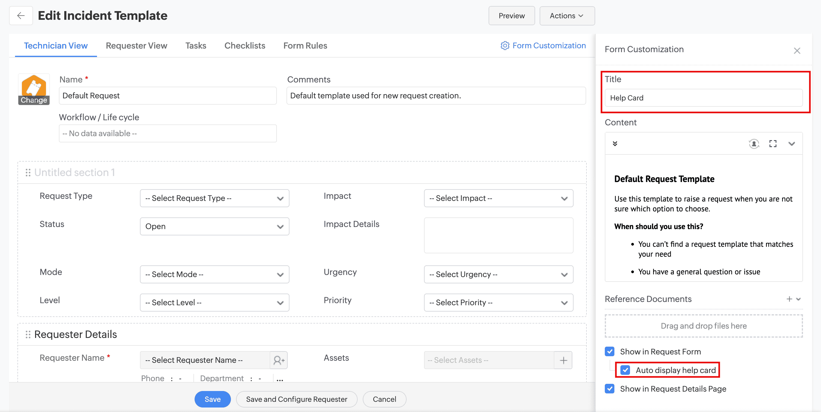 - Auto display help card is enabled automatically for templates where Show in Request Form is already enabled. Administrators can disable this option at any time from the request template.