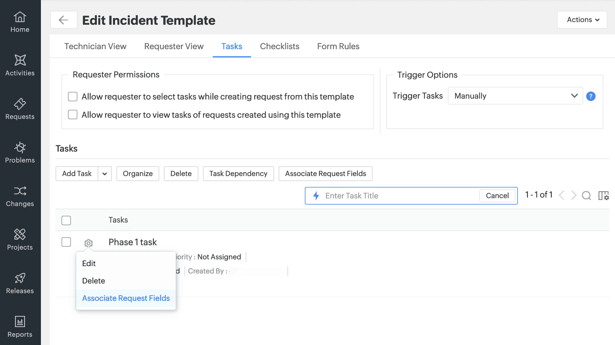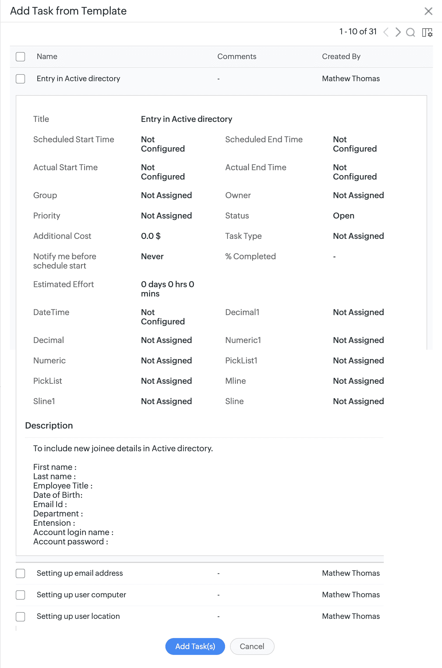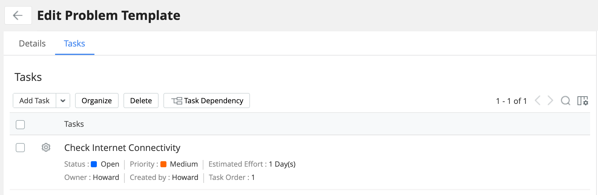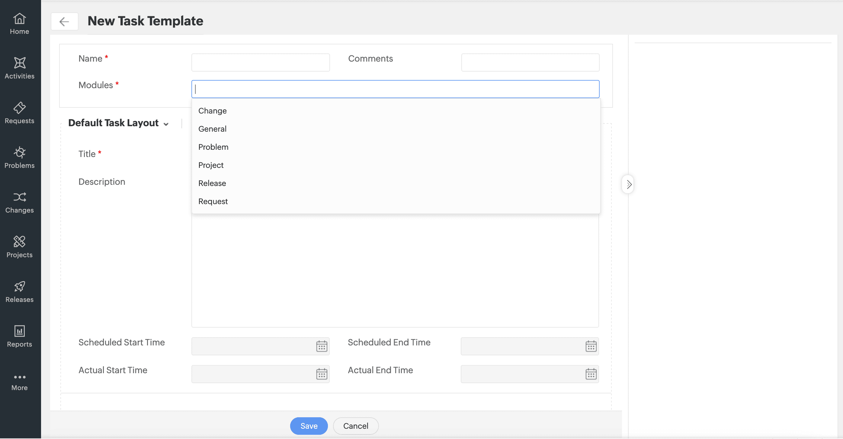 In typical help desk environments, there would be requirements to assign the same or similar tasks to different users at different times. Adding the tasks afresh every time leads to waste of time and resources. To overcome this, 'Task Templates' are provided. Templates can be created with details about the task and they could be assigned to users instantly without having to fill the details. Task Templates can be used for adding tasks on a request, problem or change.