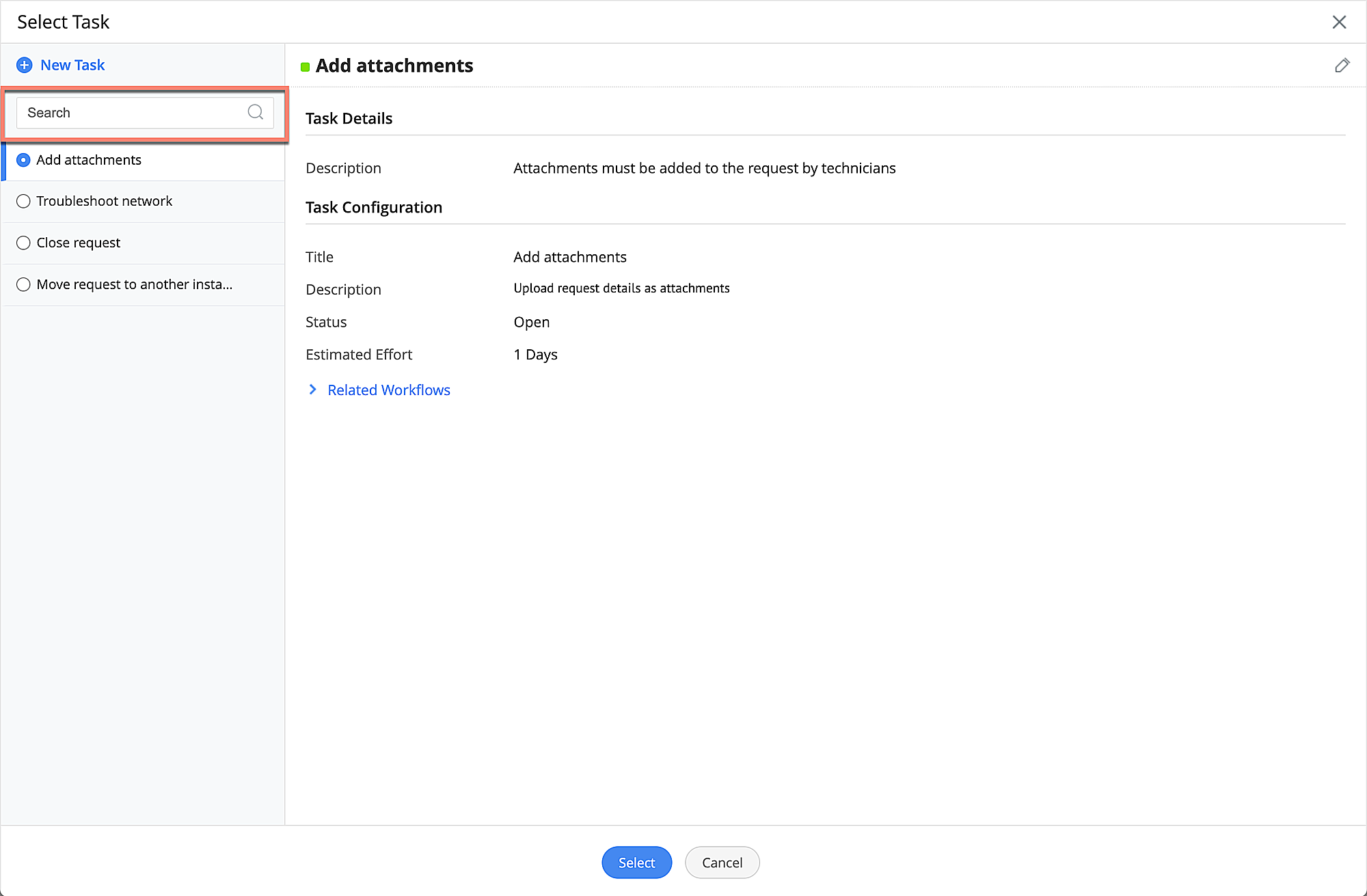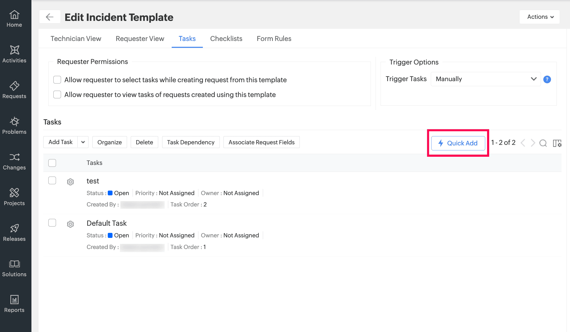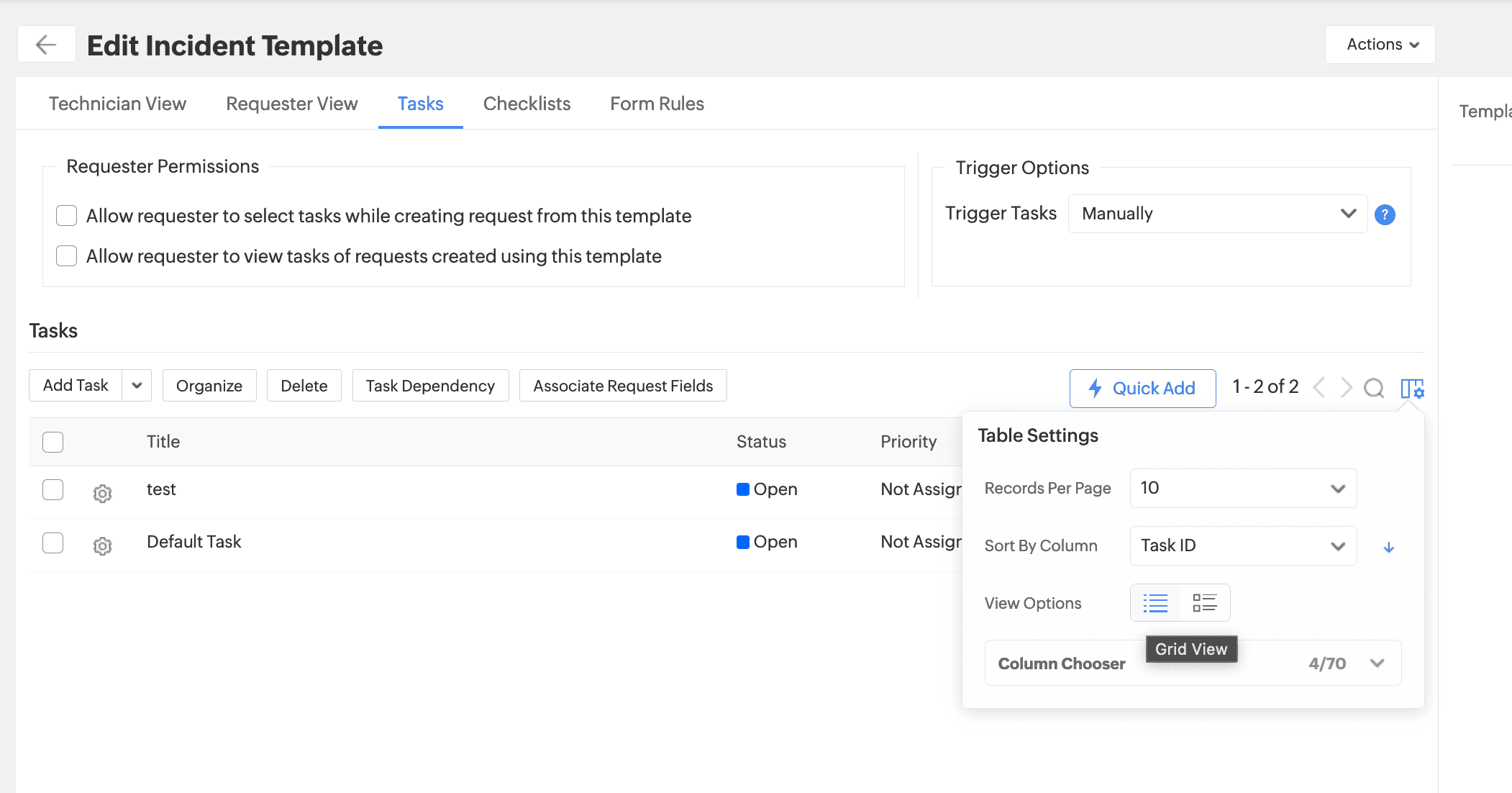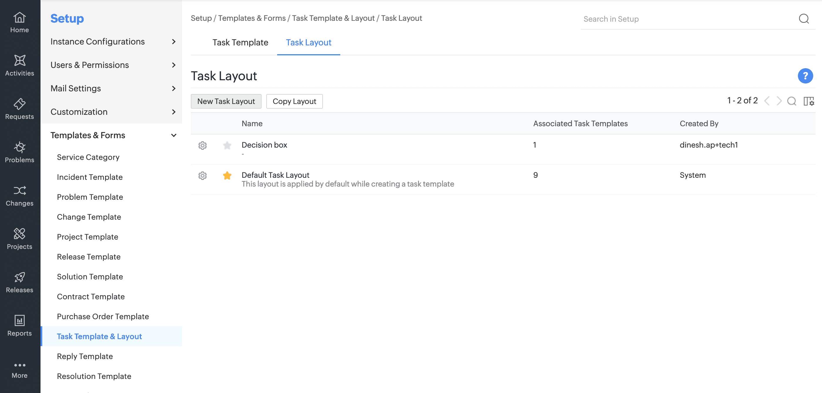 In typical help desk environments, there would be requirements to assign the same or similar tasks to different users at different times. Adding the tasks afresh every time leads to waste of time and resources. To overcome this, 'Task Templates' are provided. Templates can be created with details about the task and they could be assigned to users instantly without having to fill the details. Task Templates can be used for adding tasks on a request, problem or change.