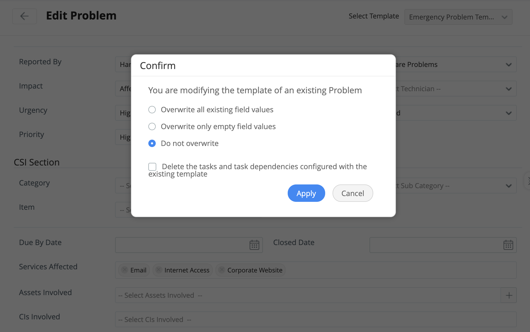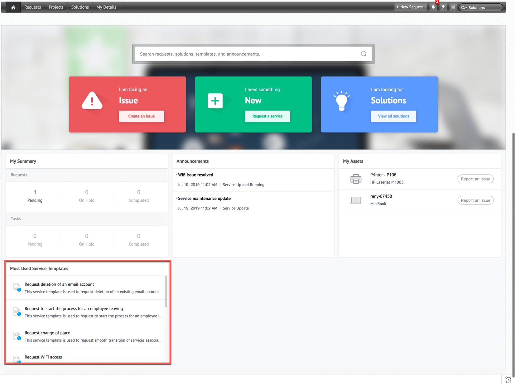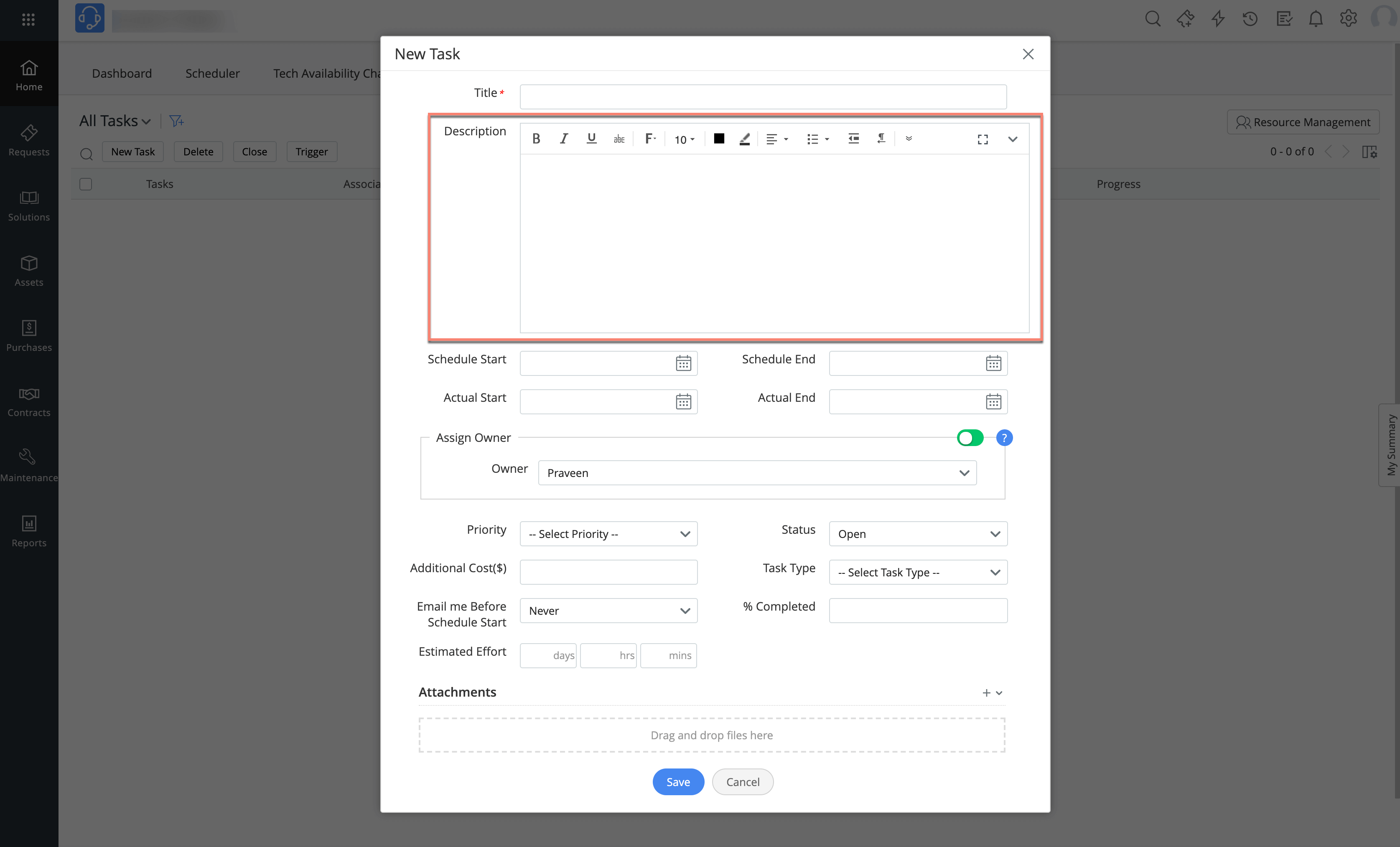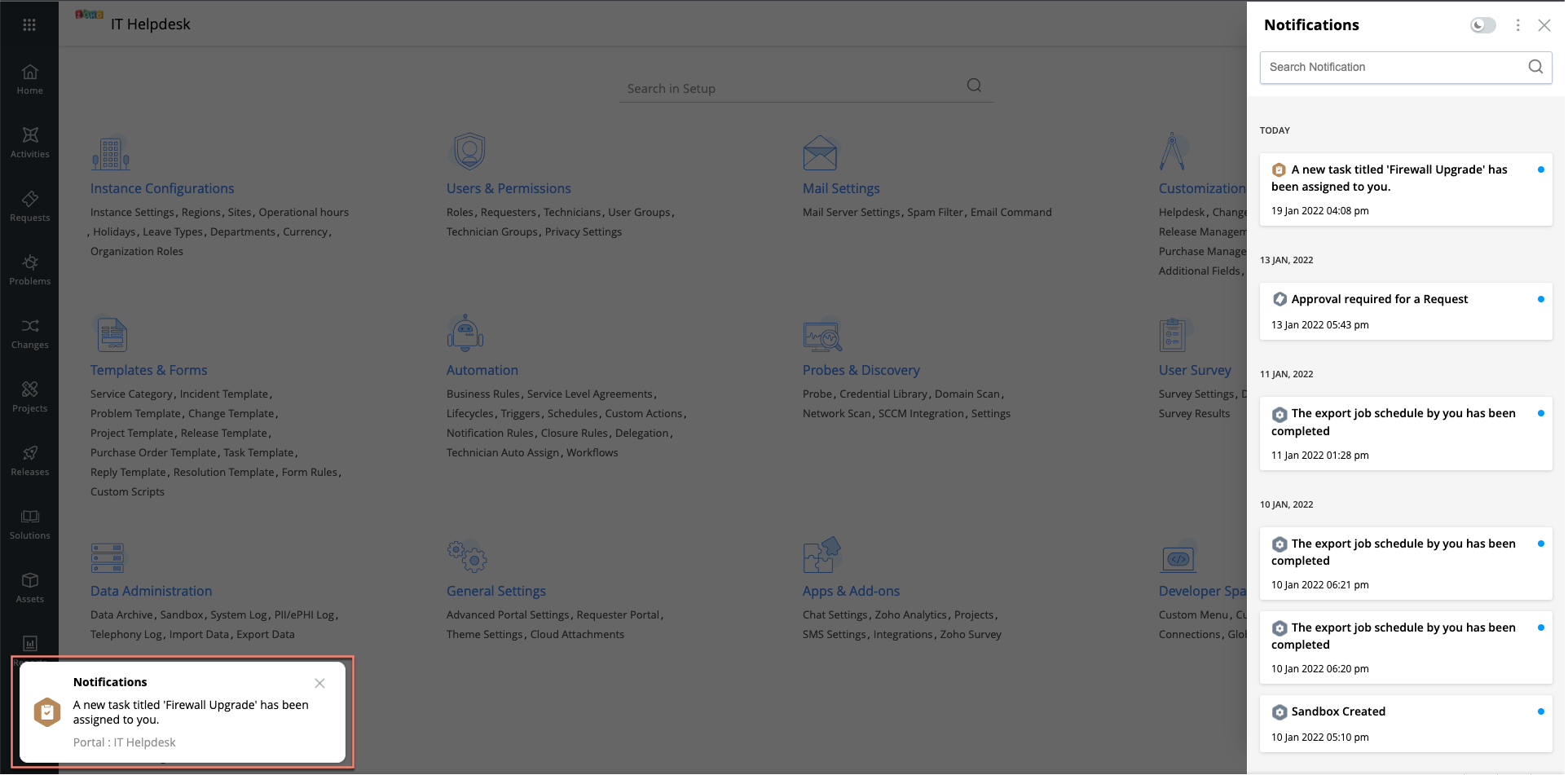 In typical help desk environments, there would be requirements to assign the same or similar tasks to different users at different times. Adding the tasks afresh every time leads to waste of time and resources. To overcome this, 'Task Templates' are provided. Templates can be created with details about the task and they could be assigned to users instantly without having to fill the details. Task Templates can be used for adding tasks on a request, problem or change.
