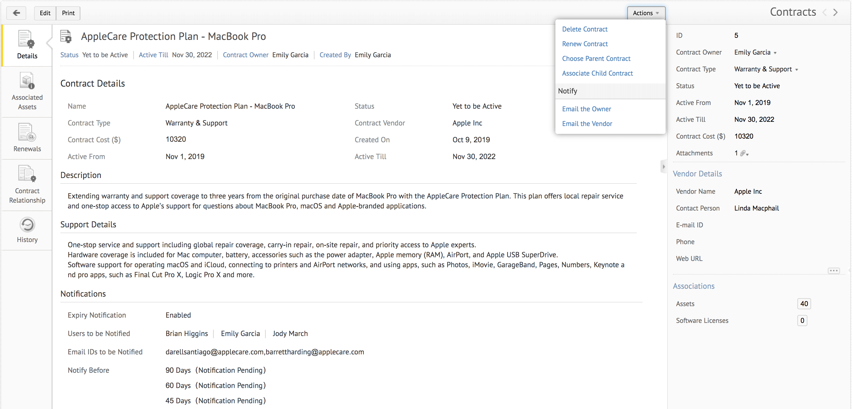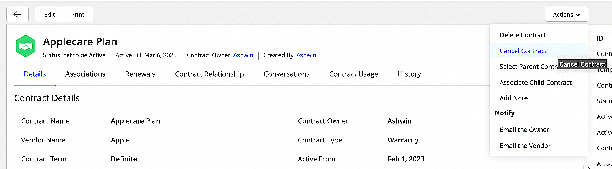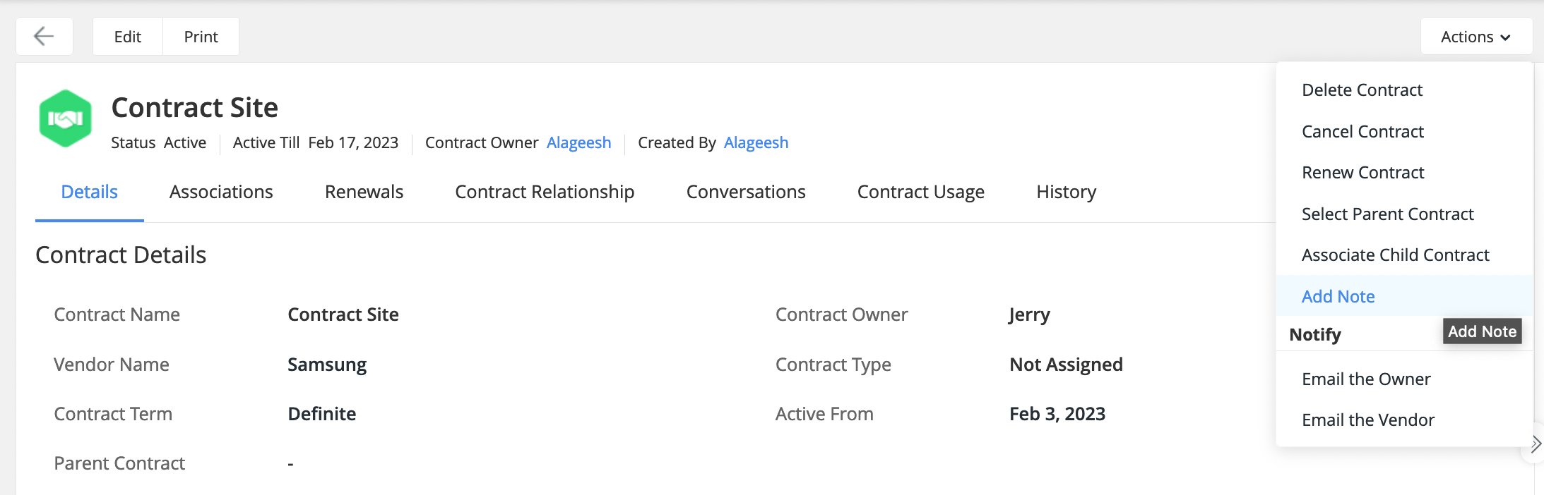 Perform various record-specific actions such as Assign, Close, Edit, Merge, Manage Followers, Add Note and Tasks, Share, and more. |