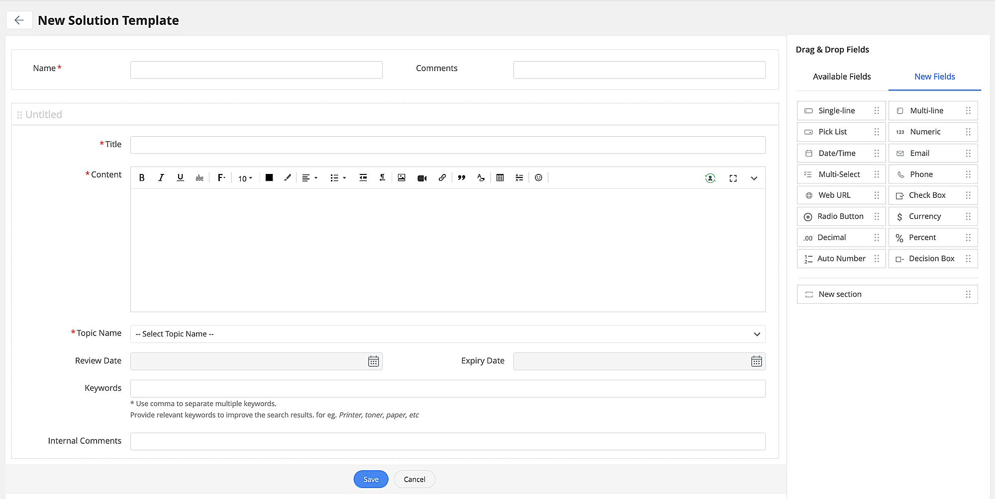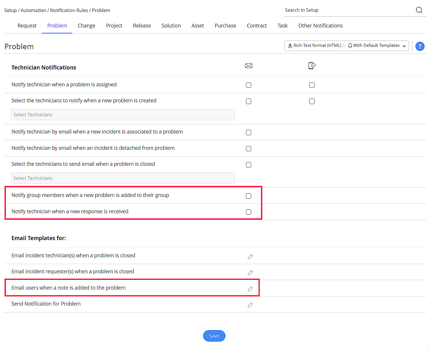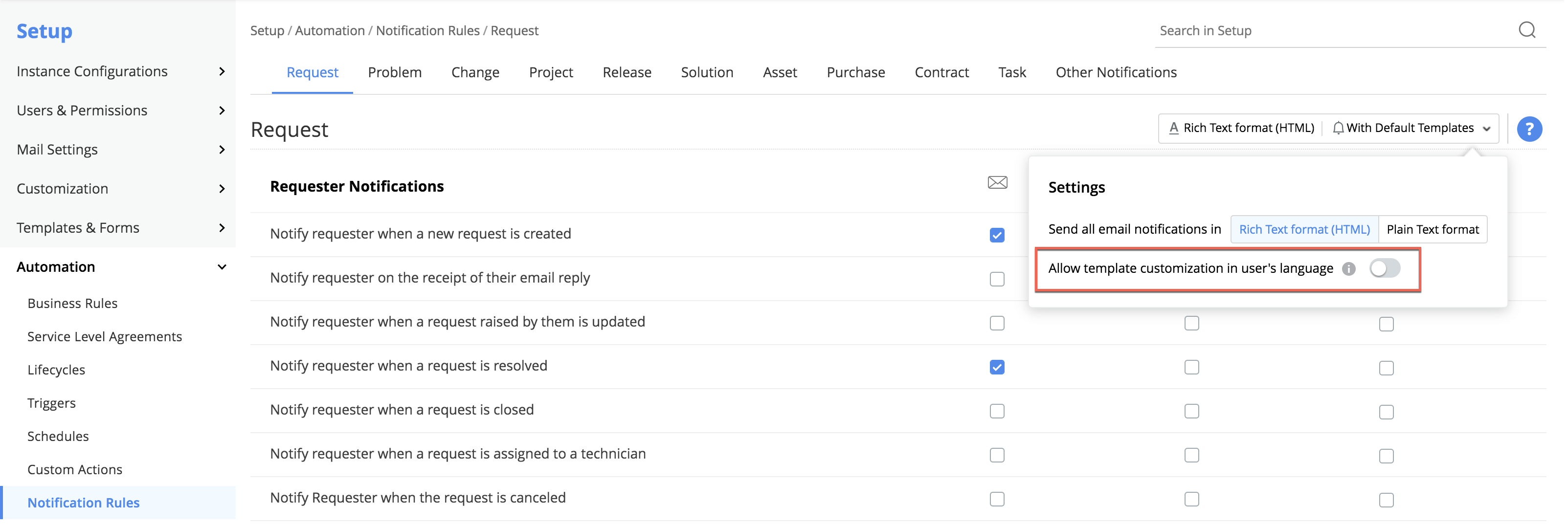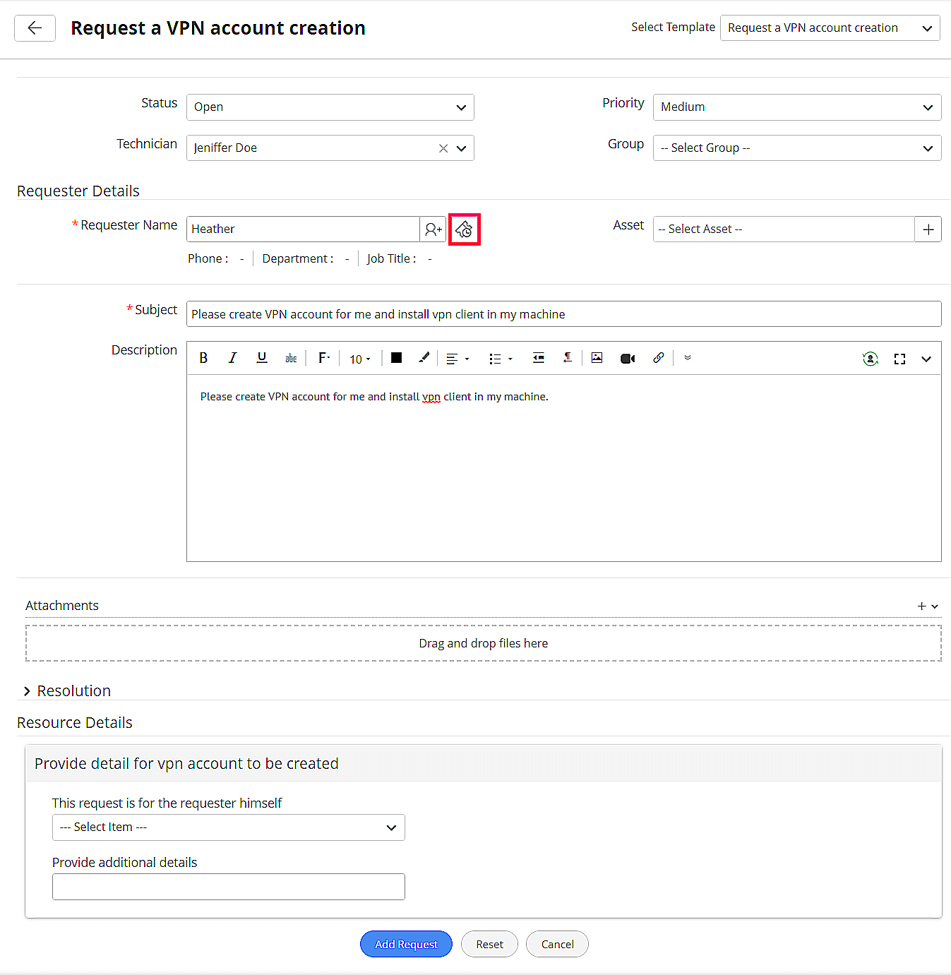 In day-to-day customer support, quite often the technicians will receive requests that involve the same or similar solution. In such cases, instead of typing the solution repeatedly, 'Resolution Templates' could be created. The template will contain the solution, which can be sent to the customers instantly.