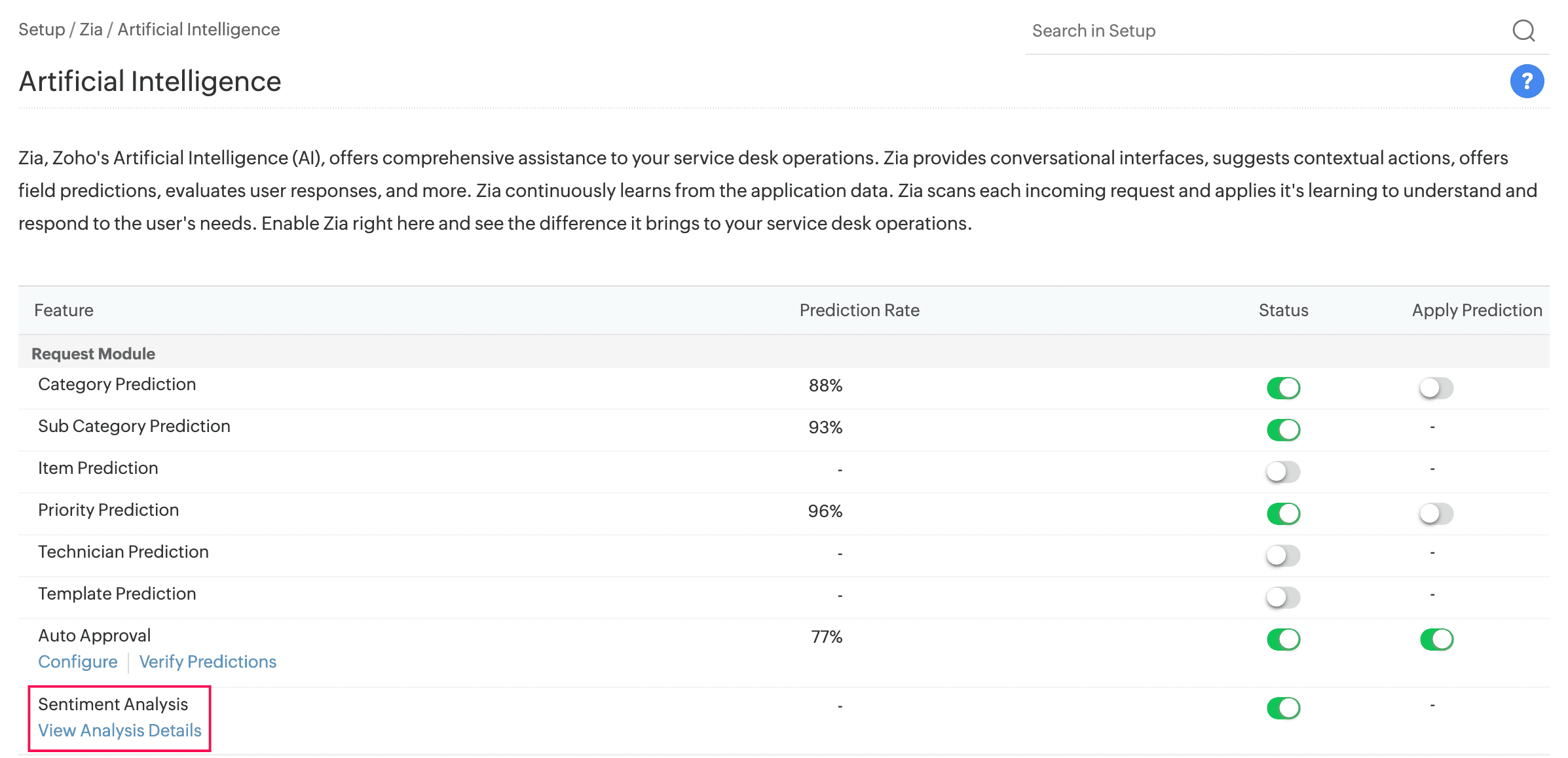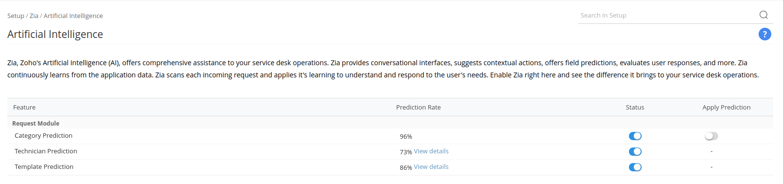 Introducing Zia Dashboard, a centralized interface that provides insights on how various Zia-powered features are being used within your ServiceDesk Plus Cloud. It provides a visual summary of the AI-driven features utilized in the application, organized into widgets across Predictive AI, GenAI, Solution Assist, Sentiment Analysis, and Zia Chatbot.