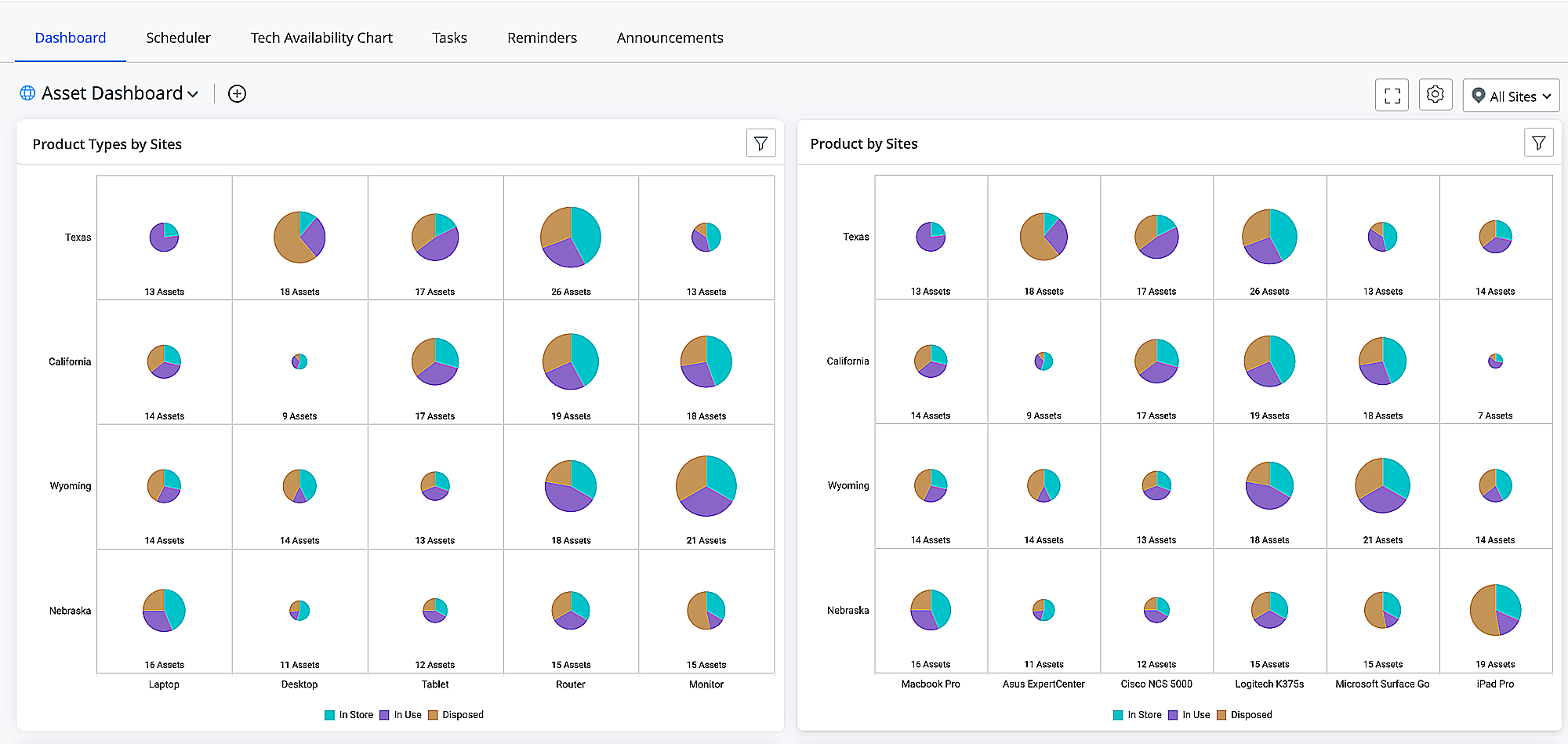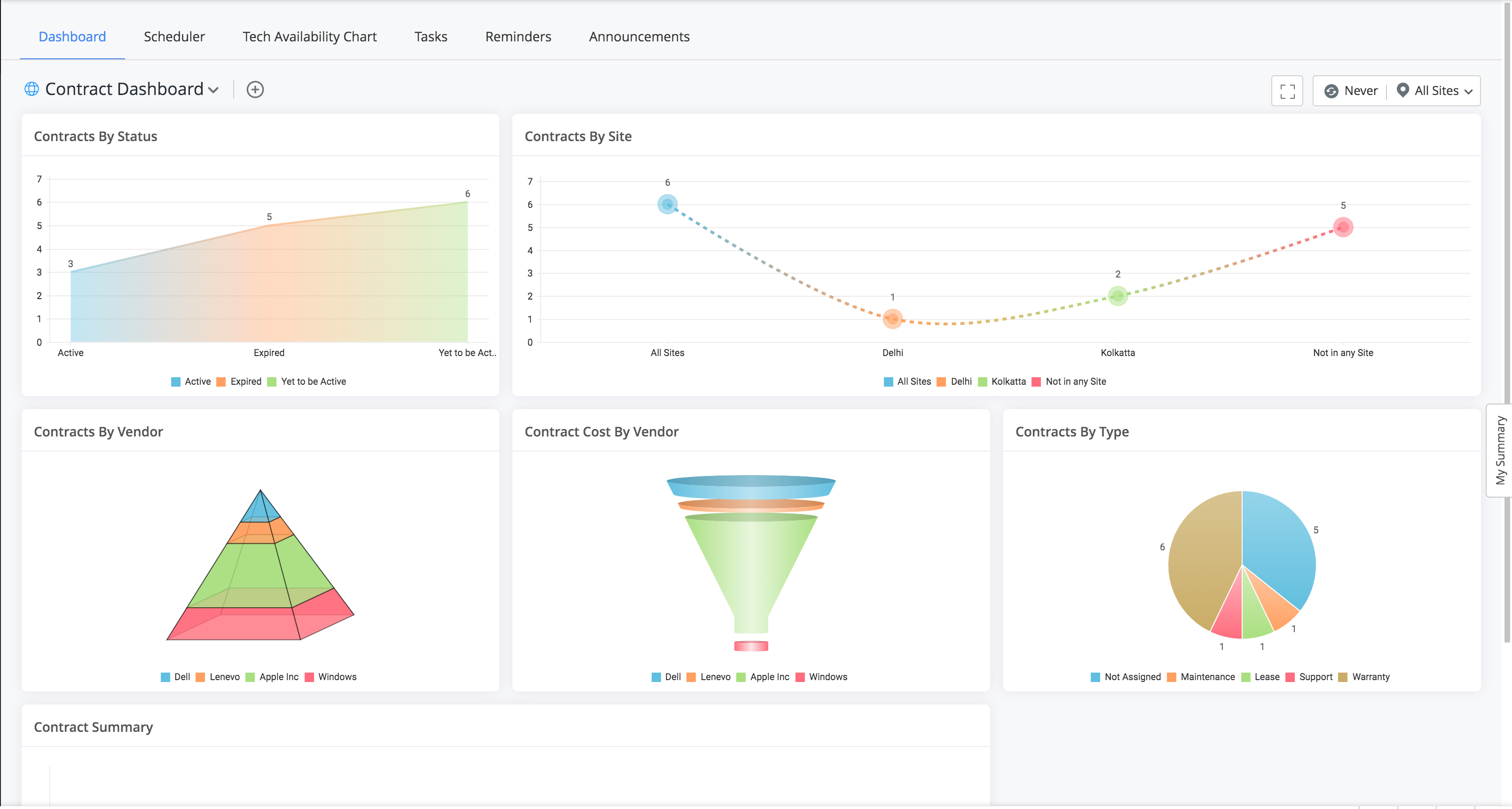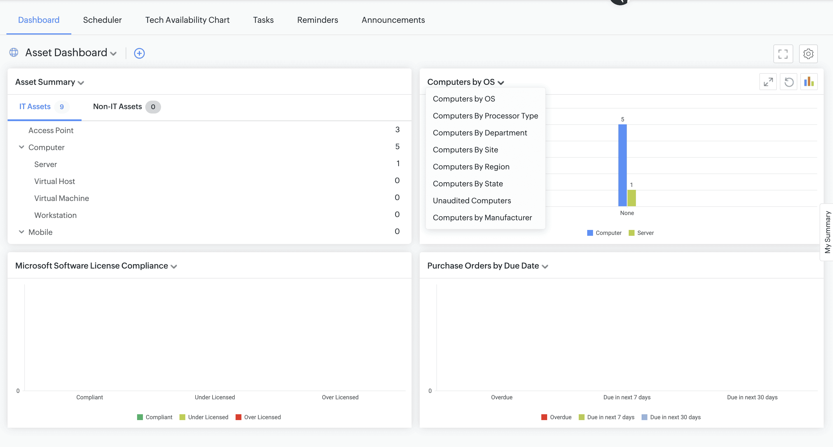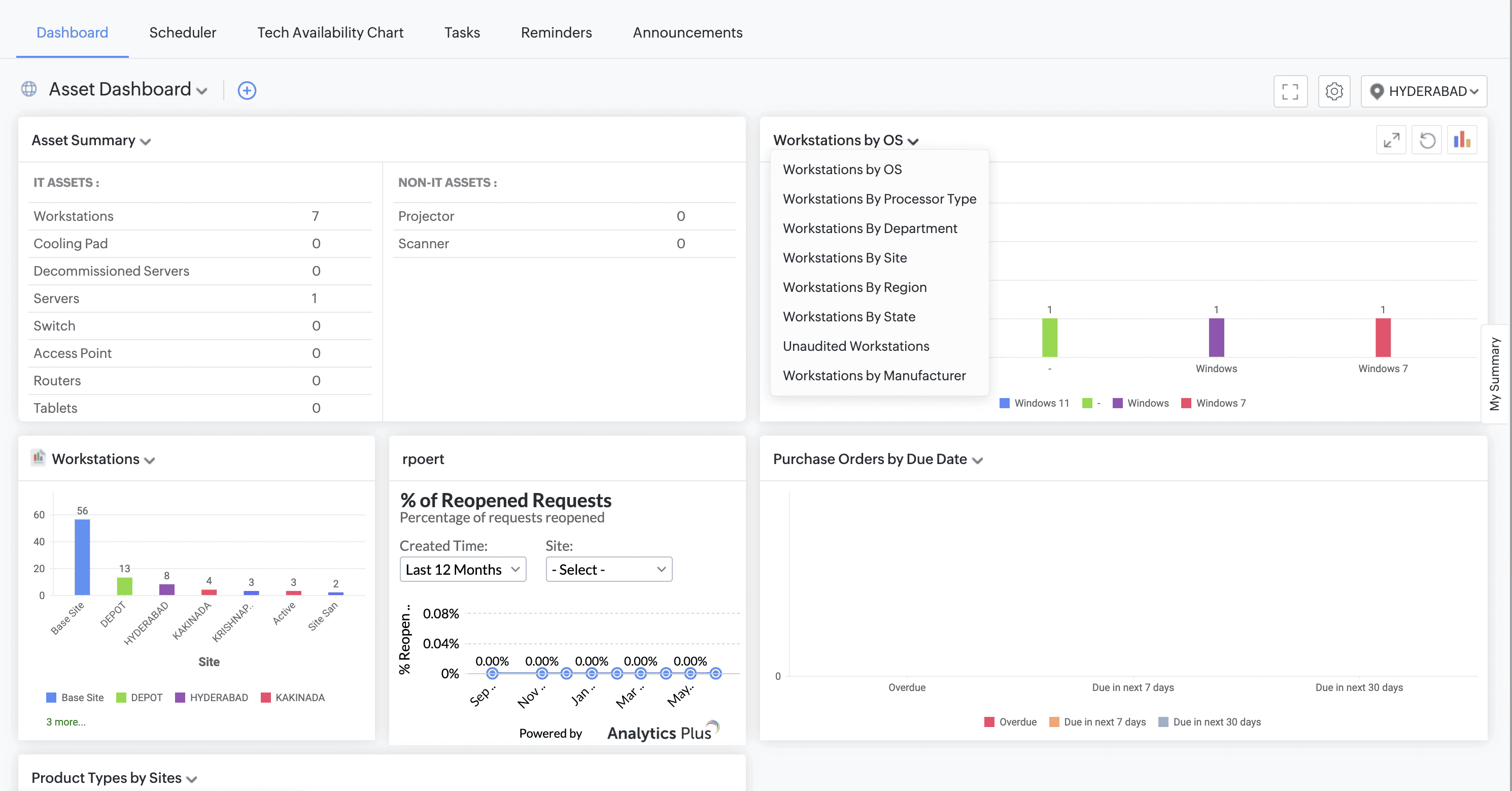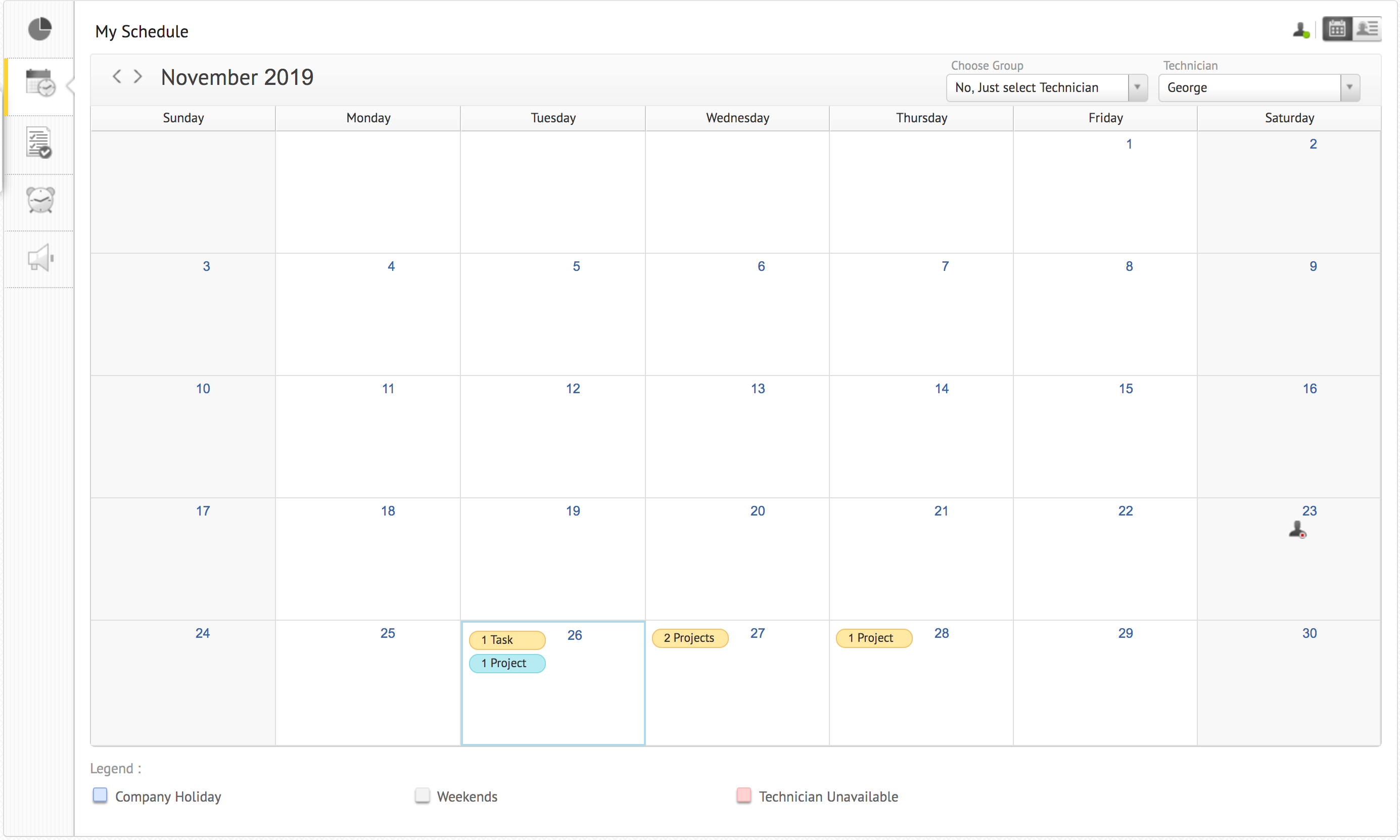 | Focus on one widget at a time and get a bird's eye view of all your key module insights. | A dynamic monthly calendar that supports the functionalities of both Technician Availability Chart and Scheduler. |