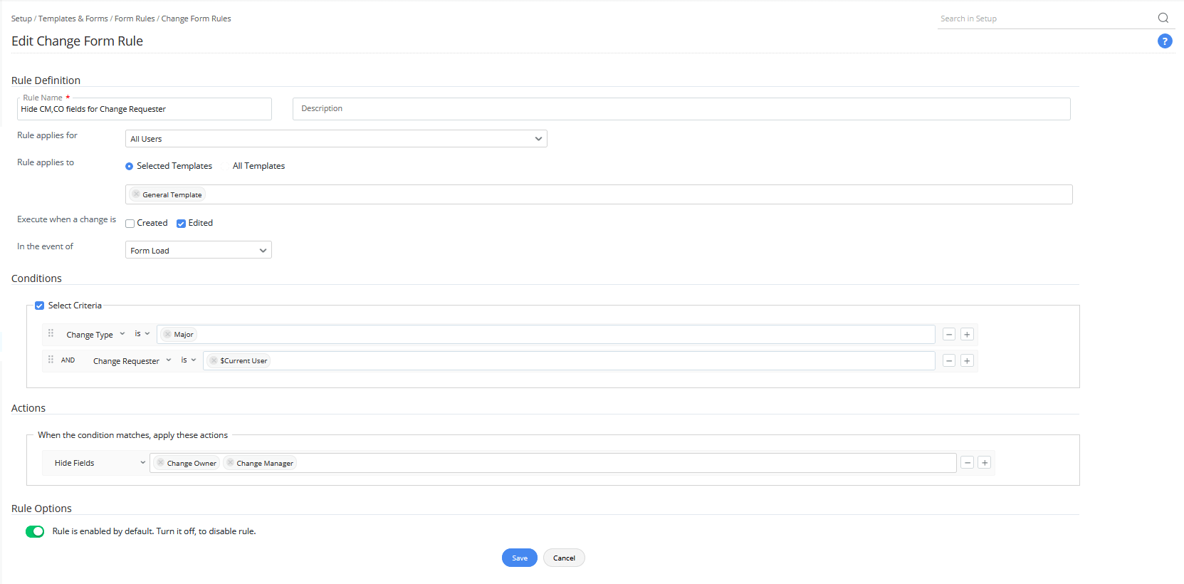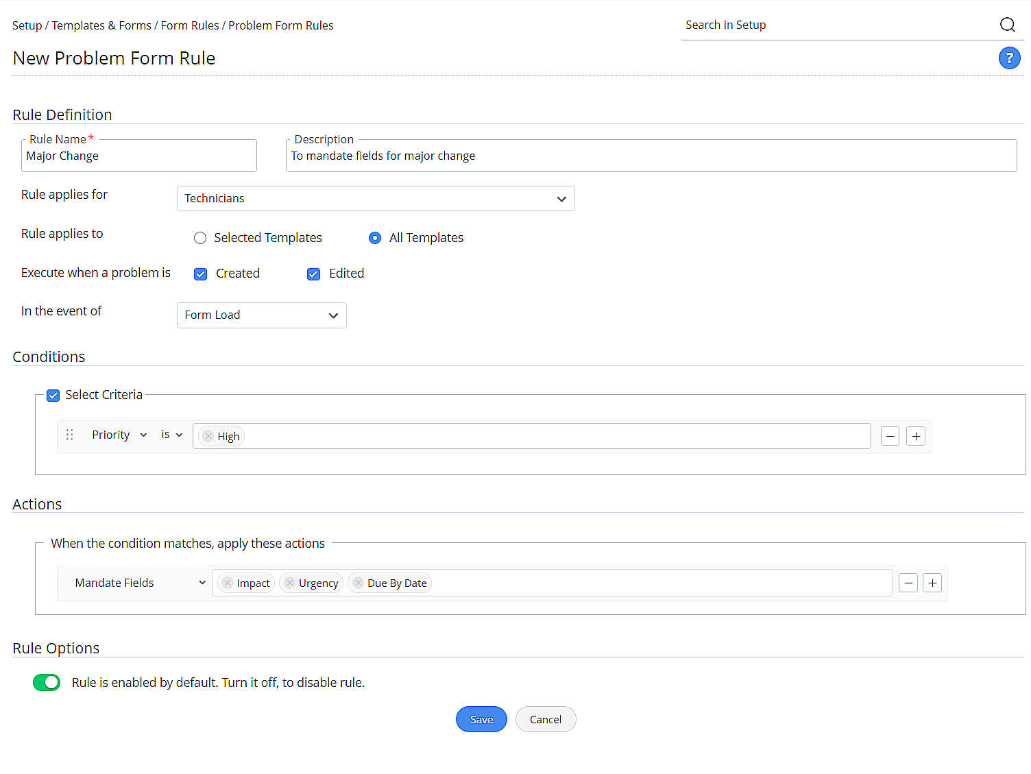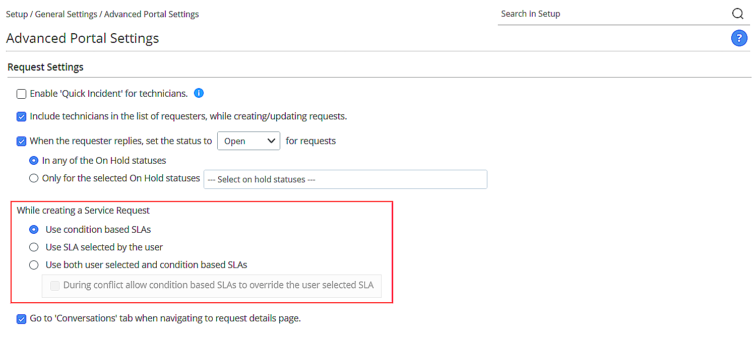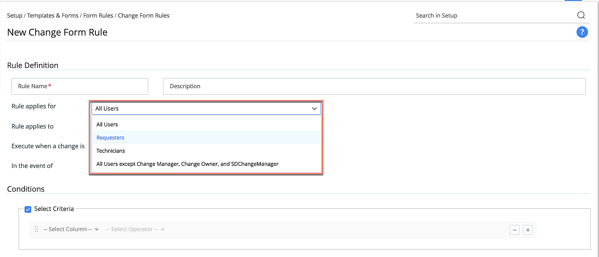 You can now add and execute Business Rules and Service Level Agreements without selecting the criteria. These Business Rules and Service Level Agreement are executed when none of the request values satisfy any parameter criteria mentioned in other Business Rules and Service Level Agreement.