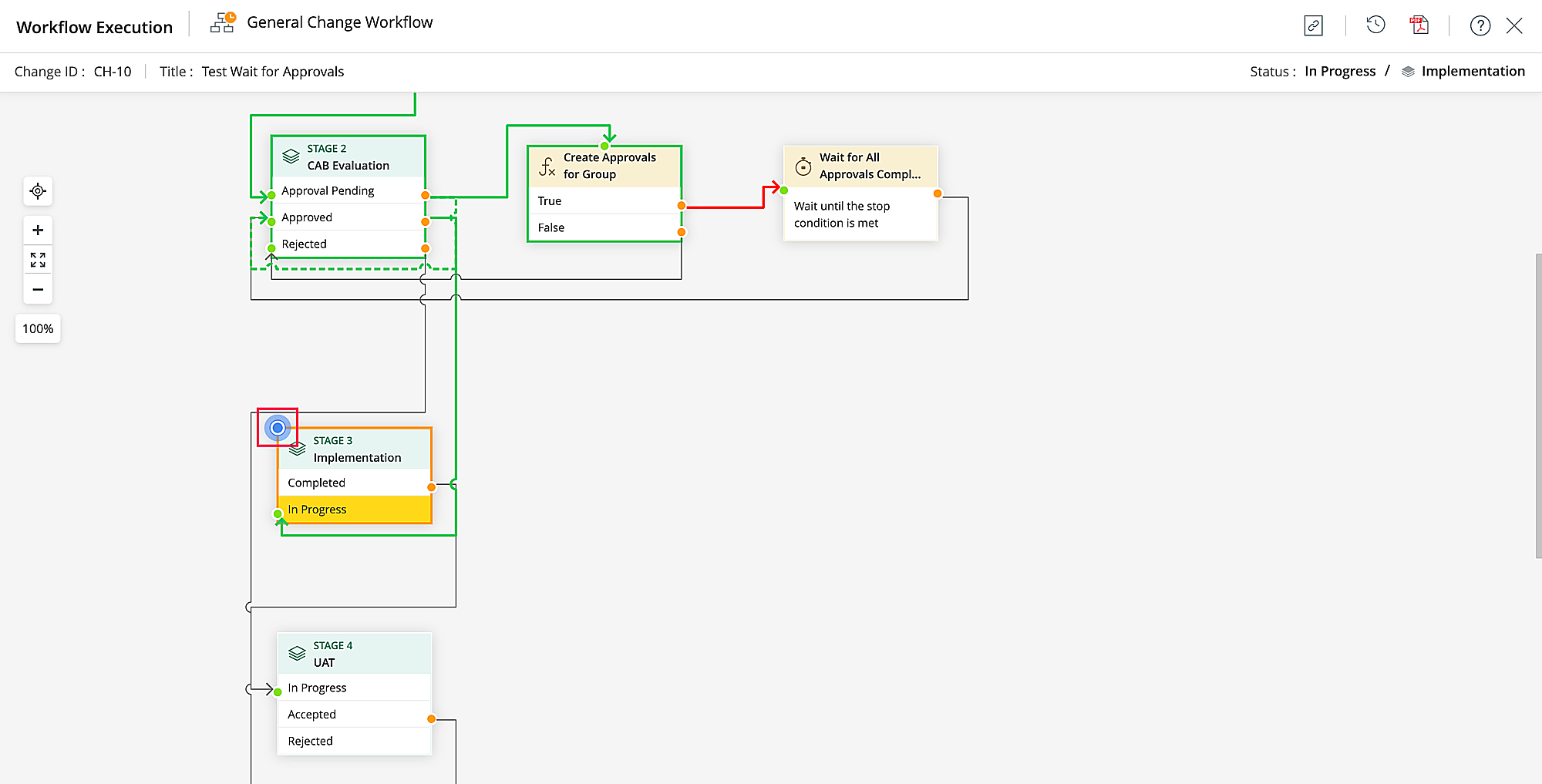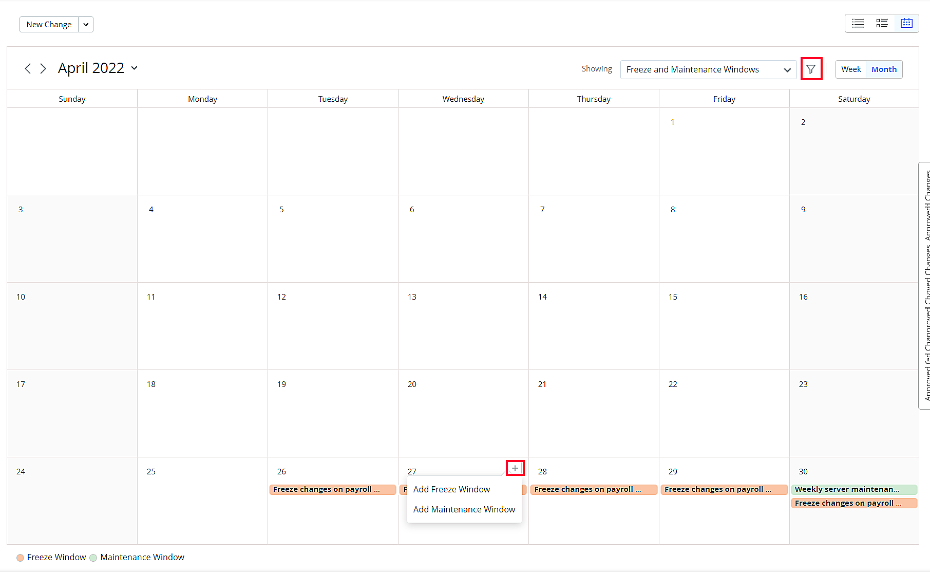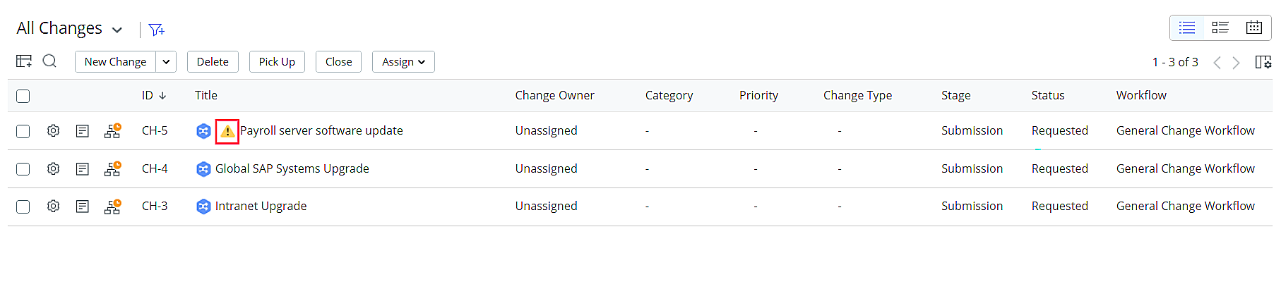 . The color code is applied based on change attributes such as Stage, Change Type, Workflow, Template, and Change Risk.
