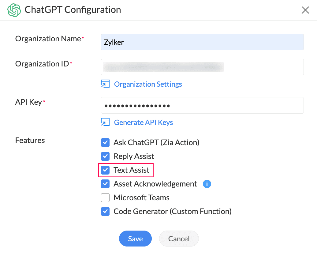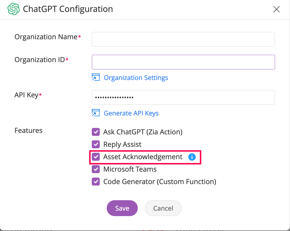 Note that Zia (Zoho-hosted LLM) does not support image input.