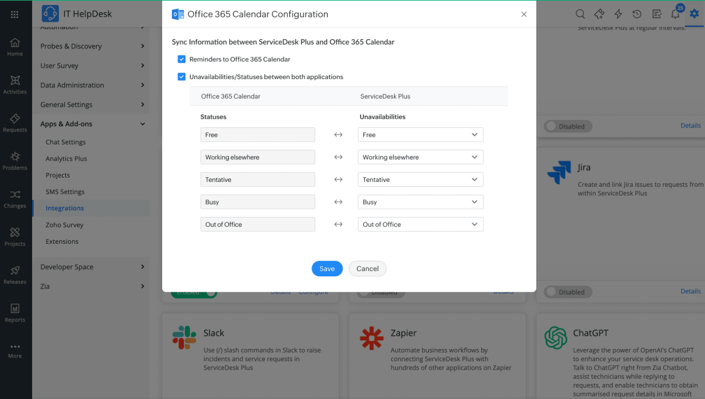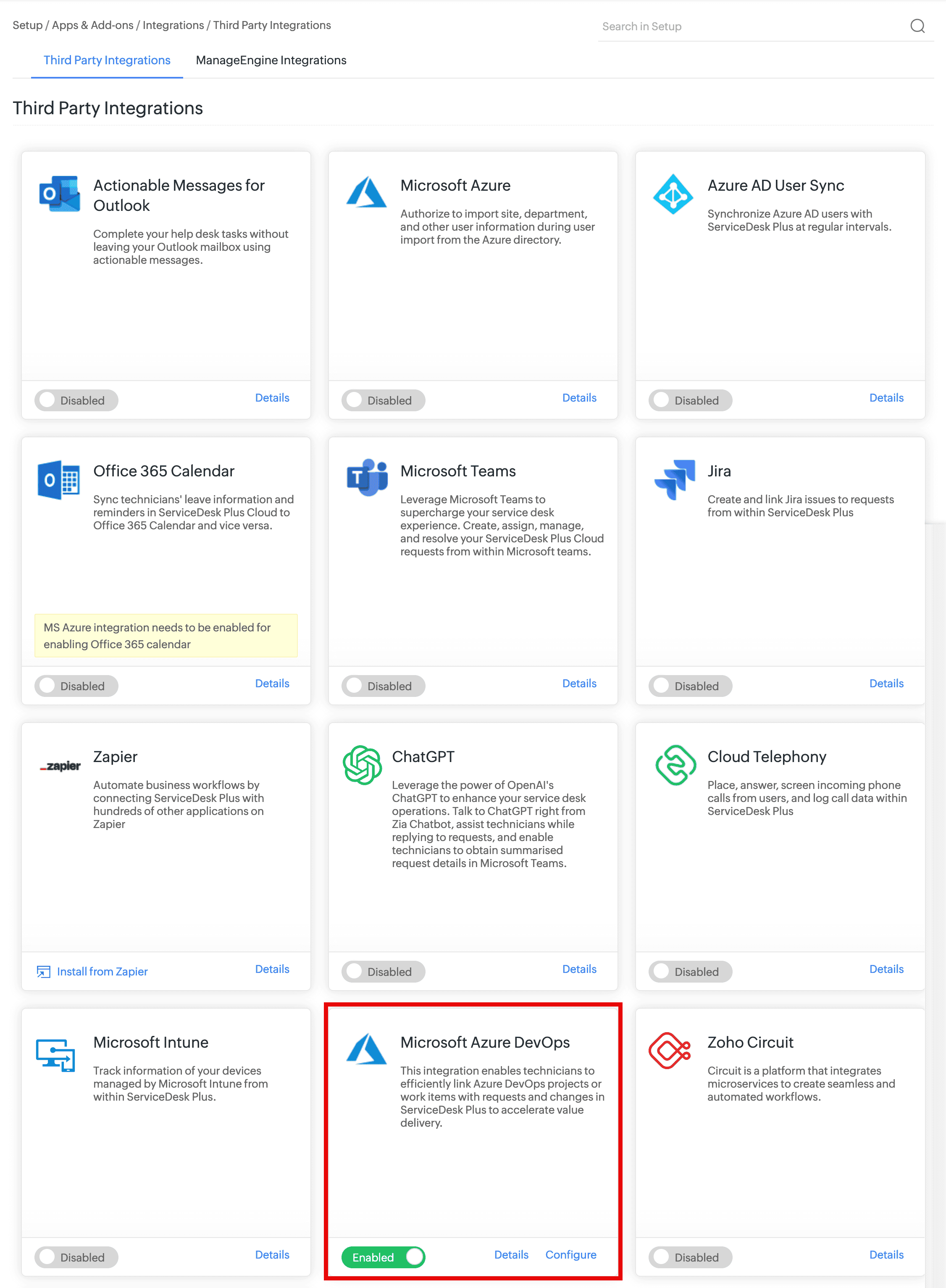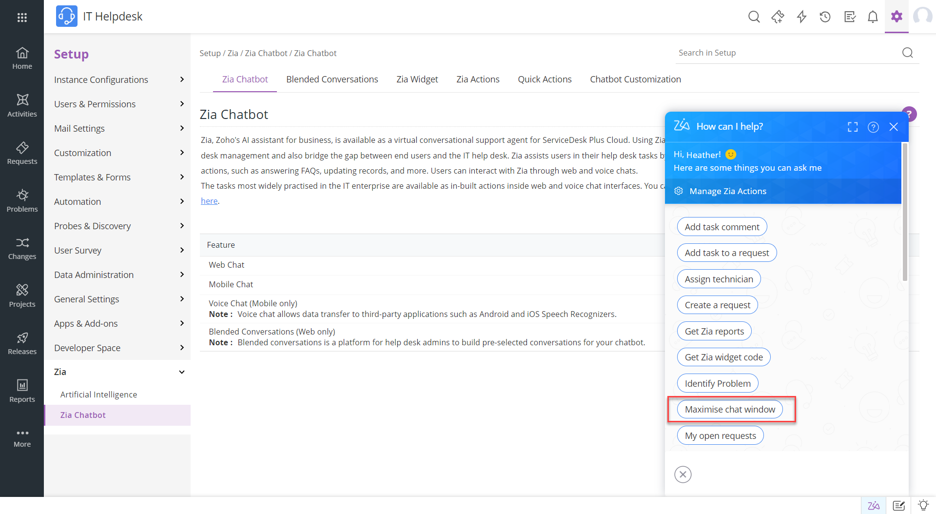 You can now execute Zia action commands directly from the ServiceDesk Plus Cloud bot in Microsoft Teams by enabling the Microsoft Teams card in the Integrations page in ServiceDesk Plus Cloud.