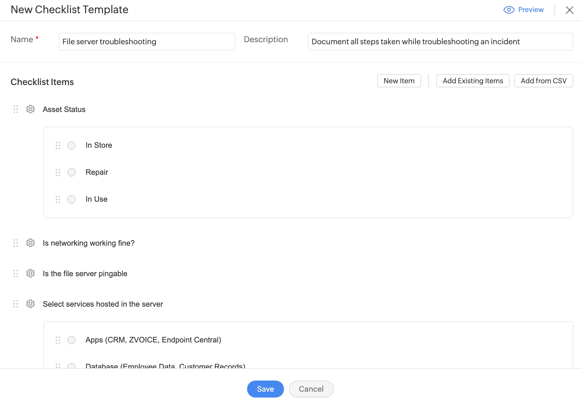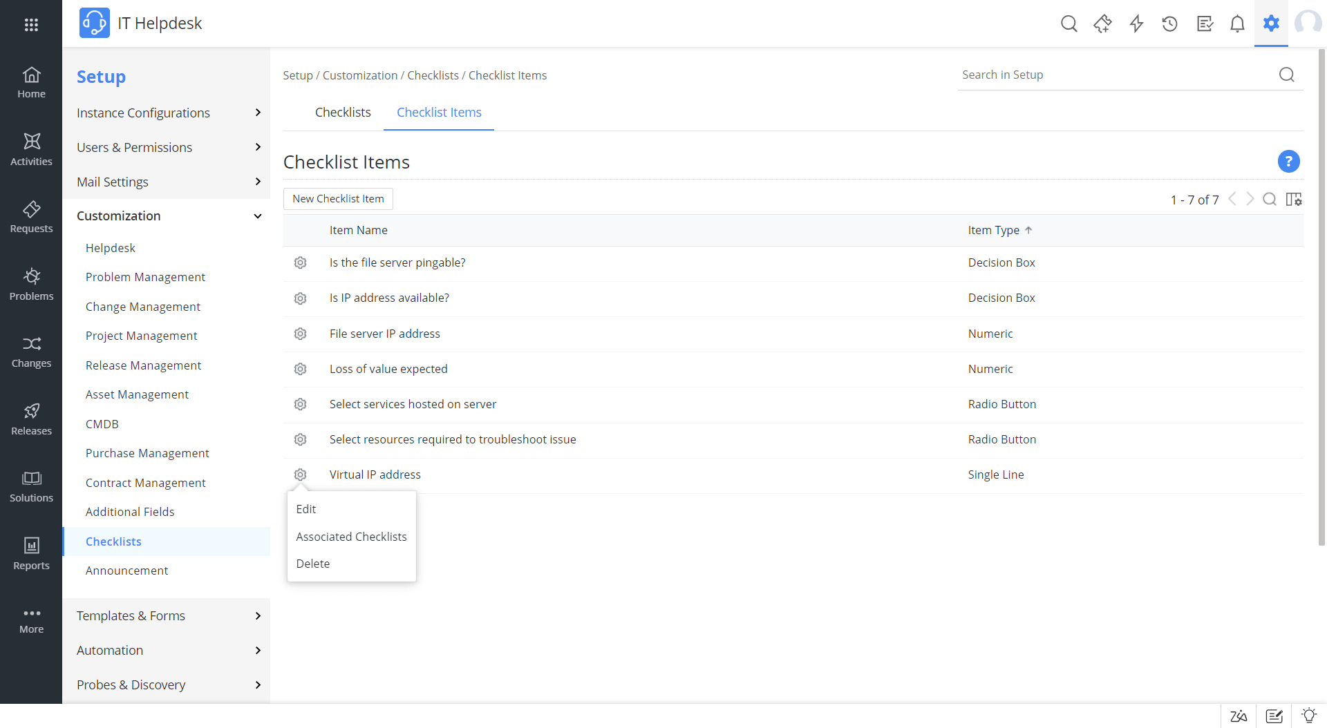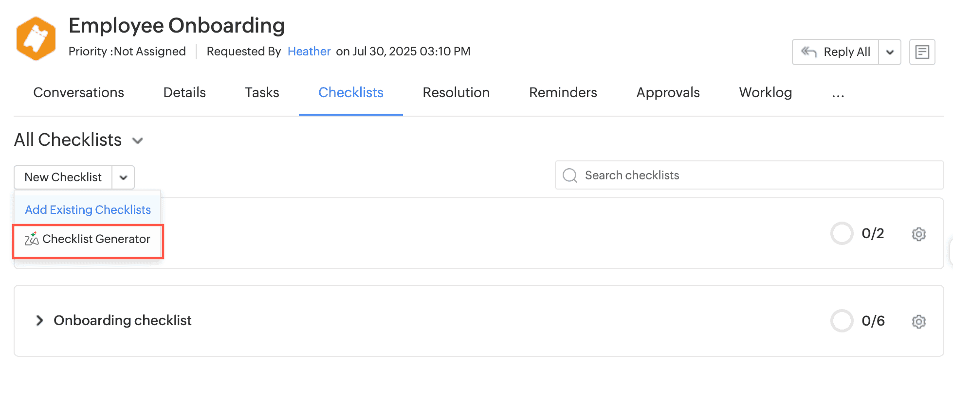 After the feature is enabled, technicians can use the Checklist Generator from the Checklist tab in Requests and Incident Templates, New/Edit Checklist, and Checklist Template forms.