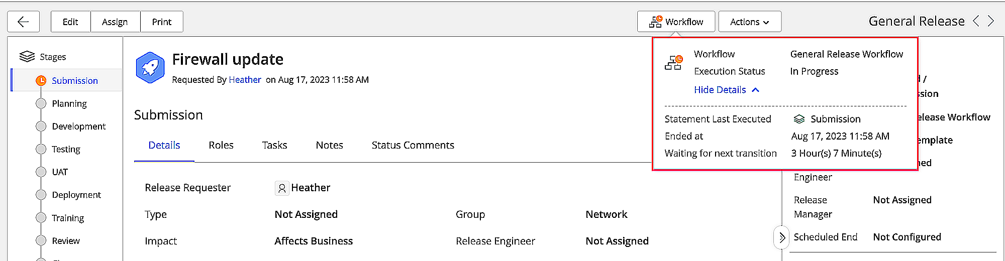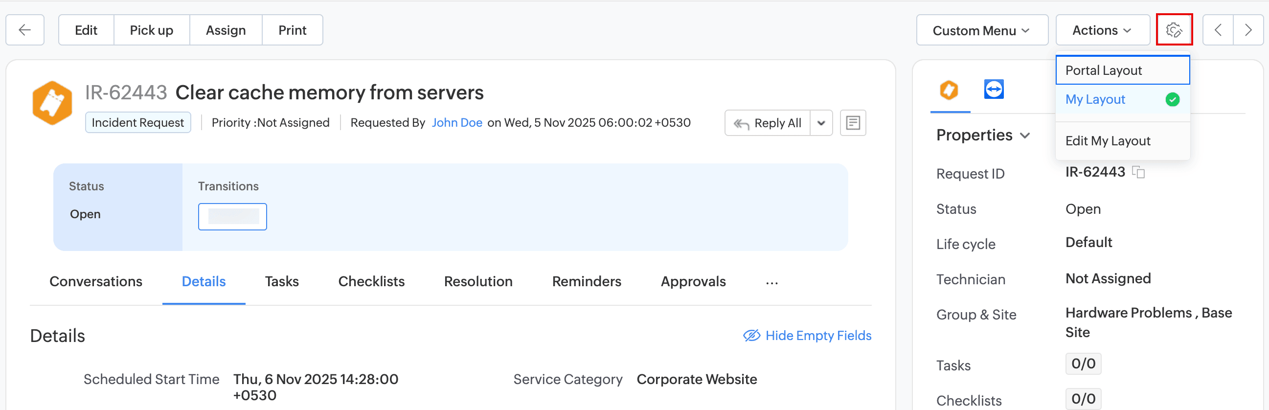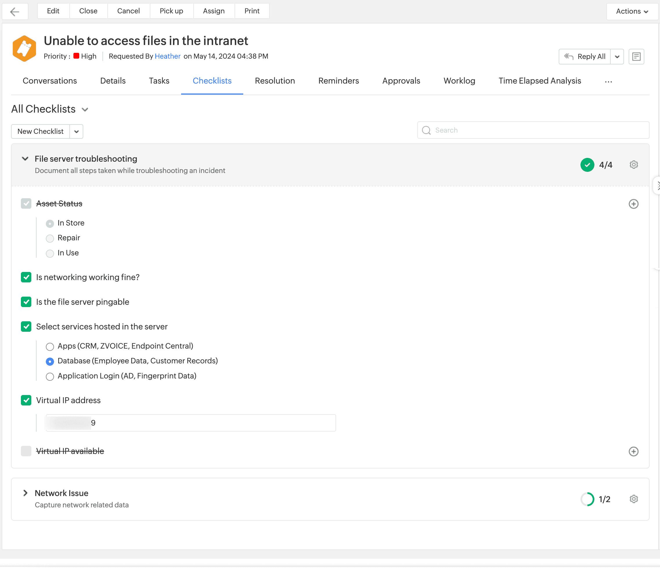 View critical details of a record, such as workflow, task and checklist progress, approval status, associated requests and changes, and more. |