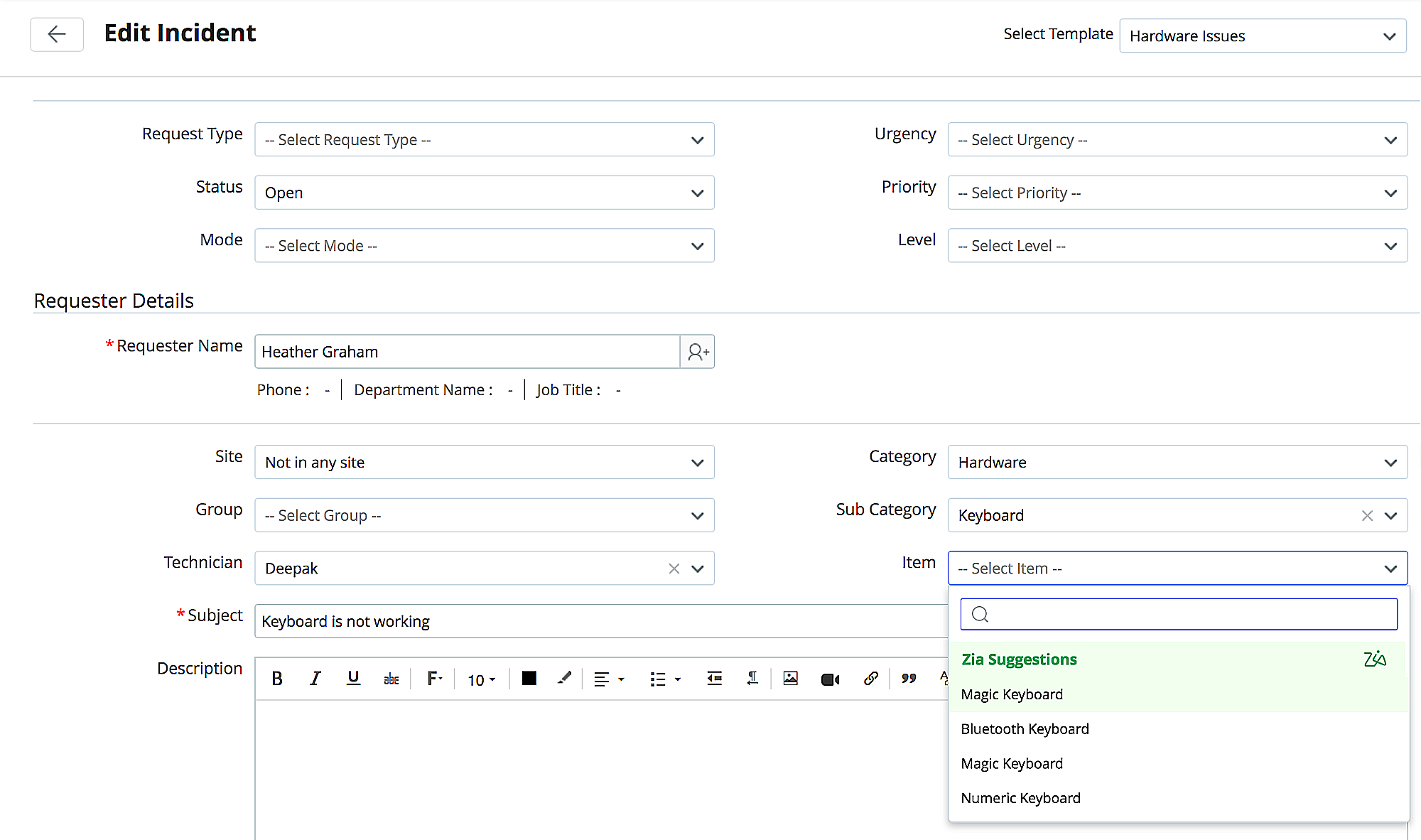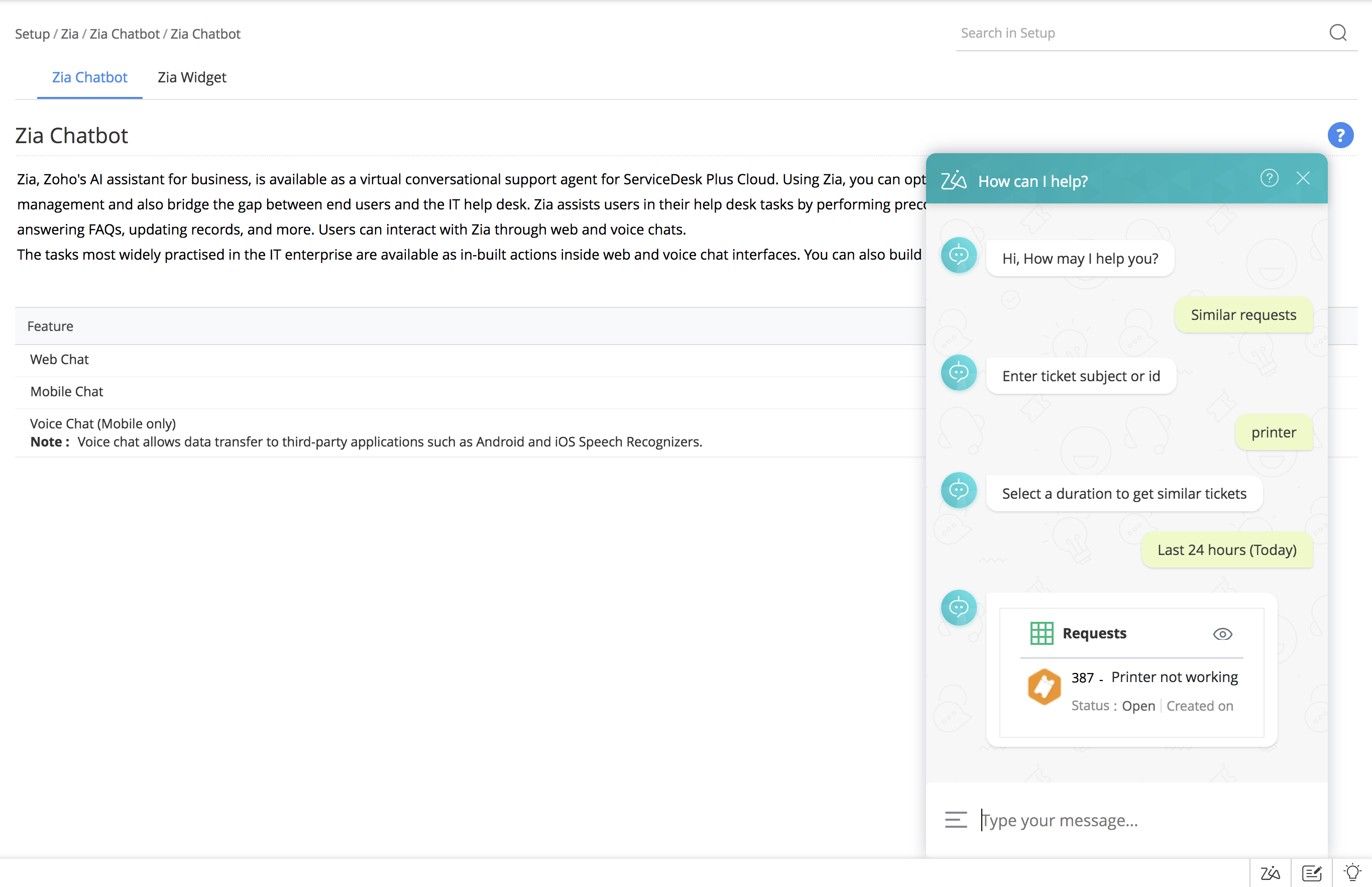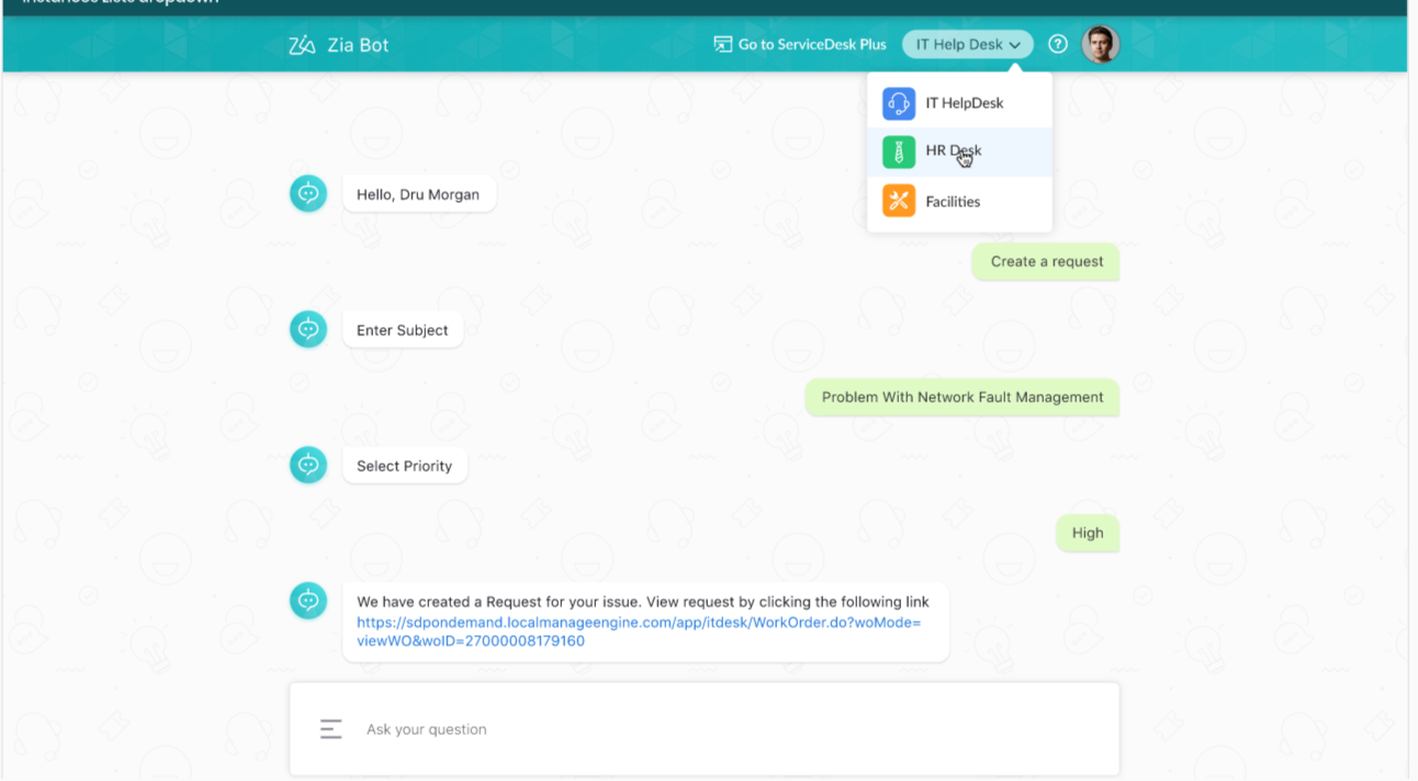By leveraging advanced natural language processing (NLP) and Retrieval-Augmented Generation (RAG) services, Ask Zia streamlines help desk tasks by creating requests, retrieving user-specific requests, fetching contextual solutions from the ServiceDesk Plus Cloud help articles, FAQs, and product best practices, and more.