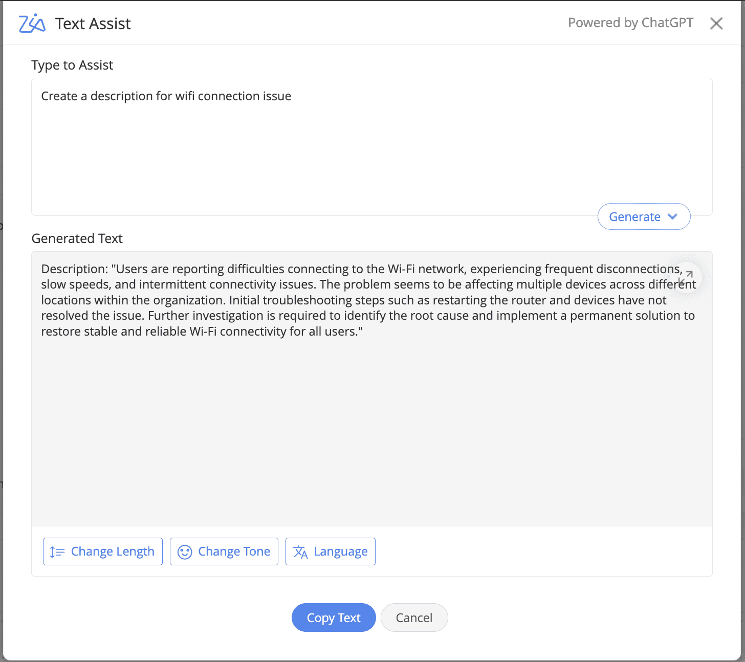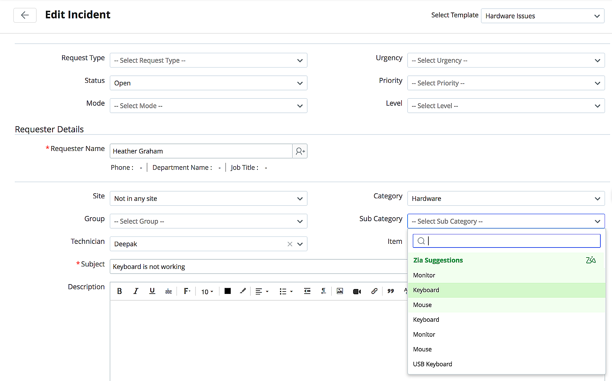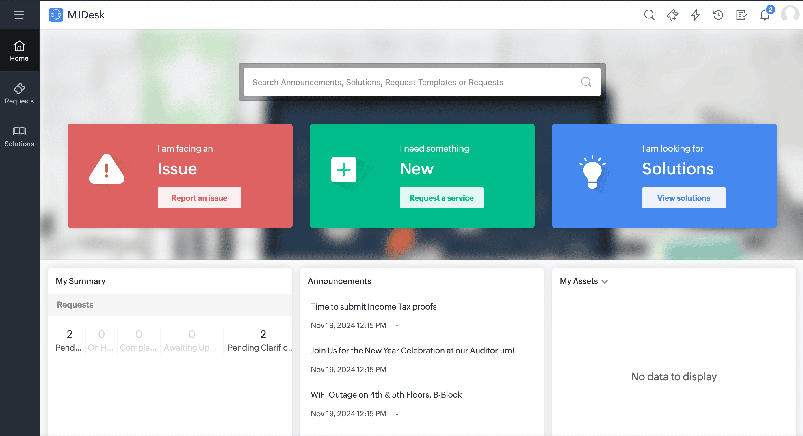 By leveraging advanced natural language processing (NLP) and Retrieval-Augmented Generation (RAG) services, Ask Zia streamlines help desk tasks by creating requests, retrieving user-specific requests, fetching contextual solutions from the ServiceDesk Plus Cloud help articles, FAQs, and product best practices, and more.