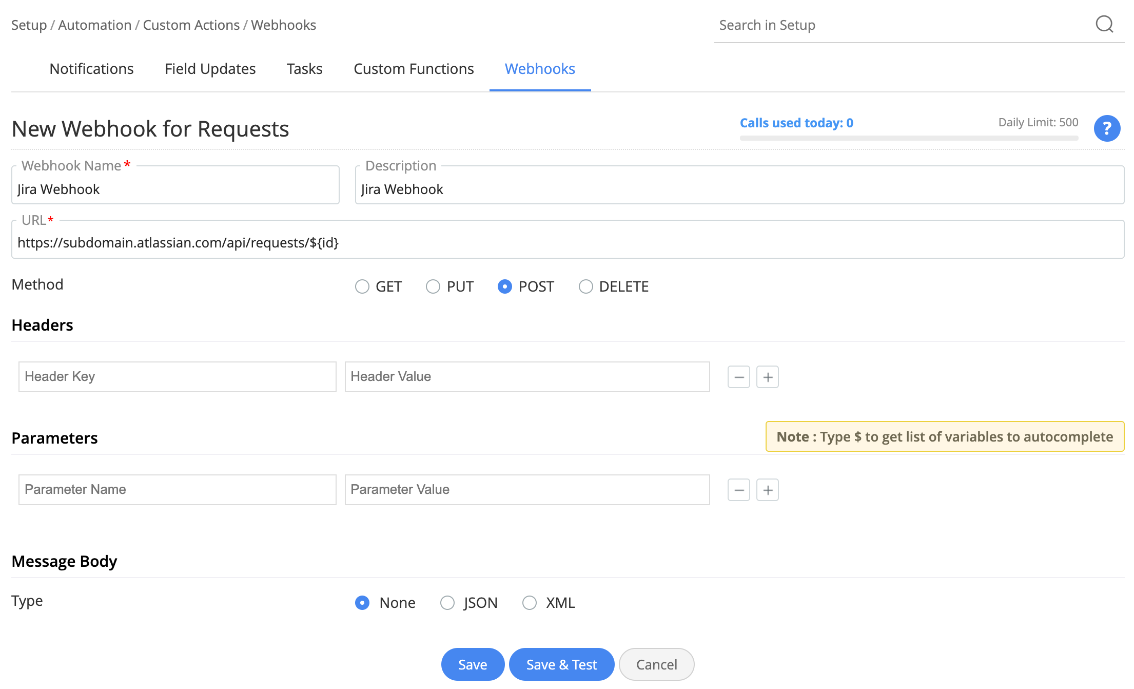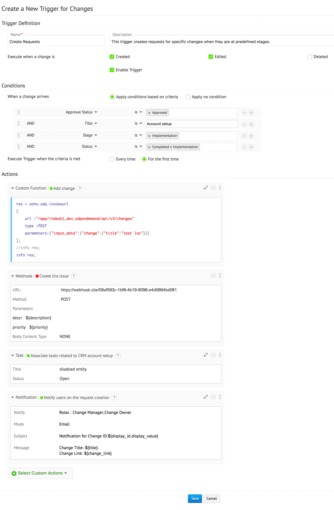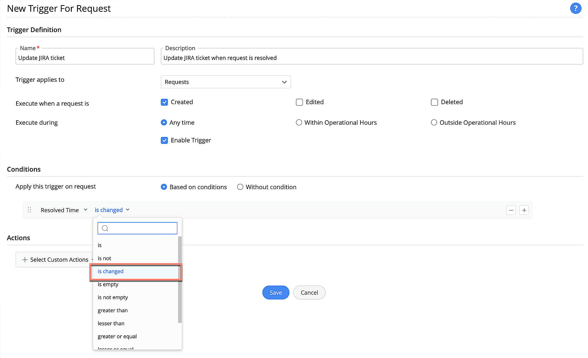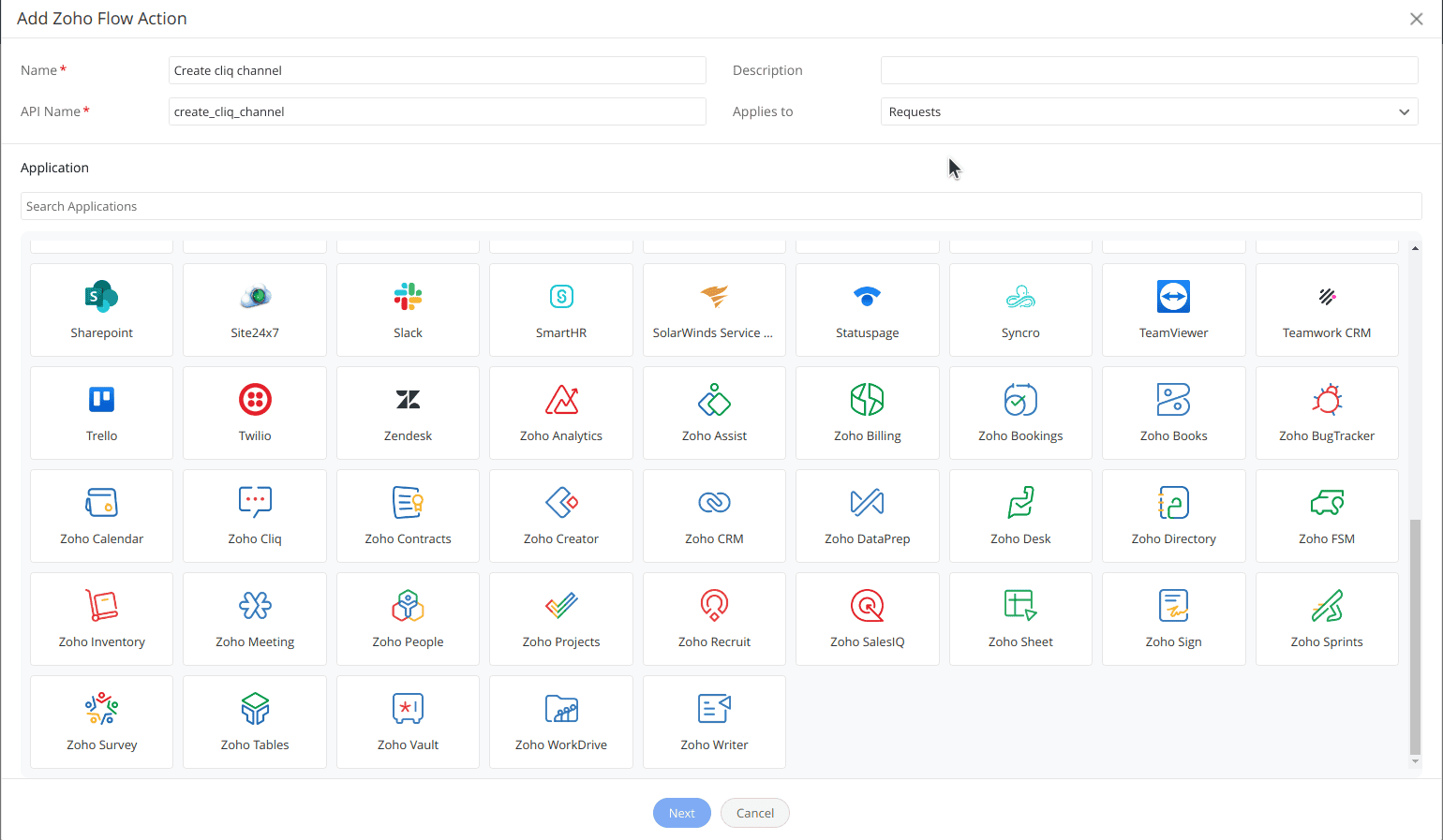 Use Zoho Flow actions, an easy to use no code solution, to extend the capabilities of triggers and workflows in ServiceDesk Plus to automate tasks across third-party apps. For instance, you can use a Zoho flow action along with triggers to create a ticket with the same subject in Jira or other applications whenever a request is created in ServiceDesk Plus Cloud. Learn more.