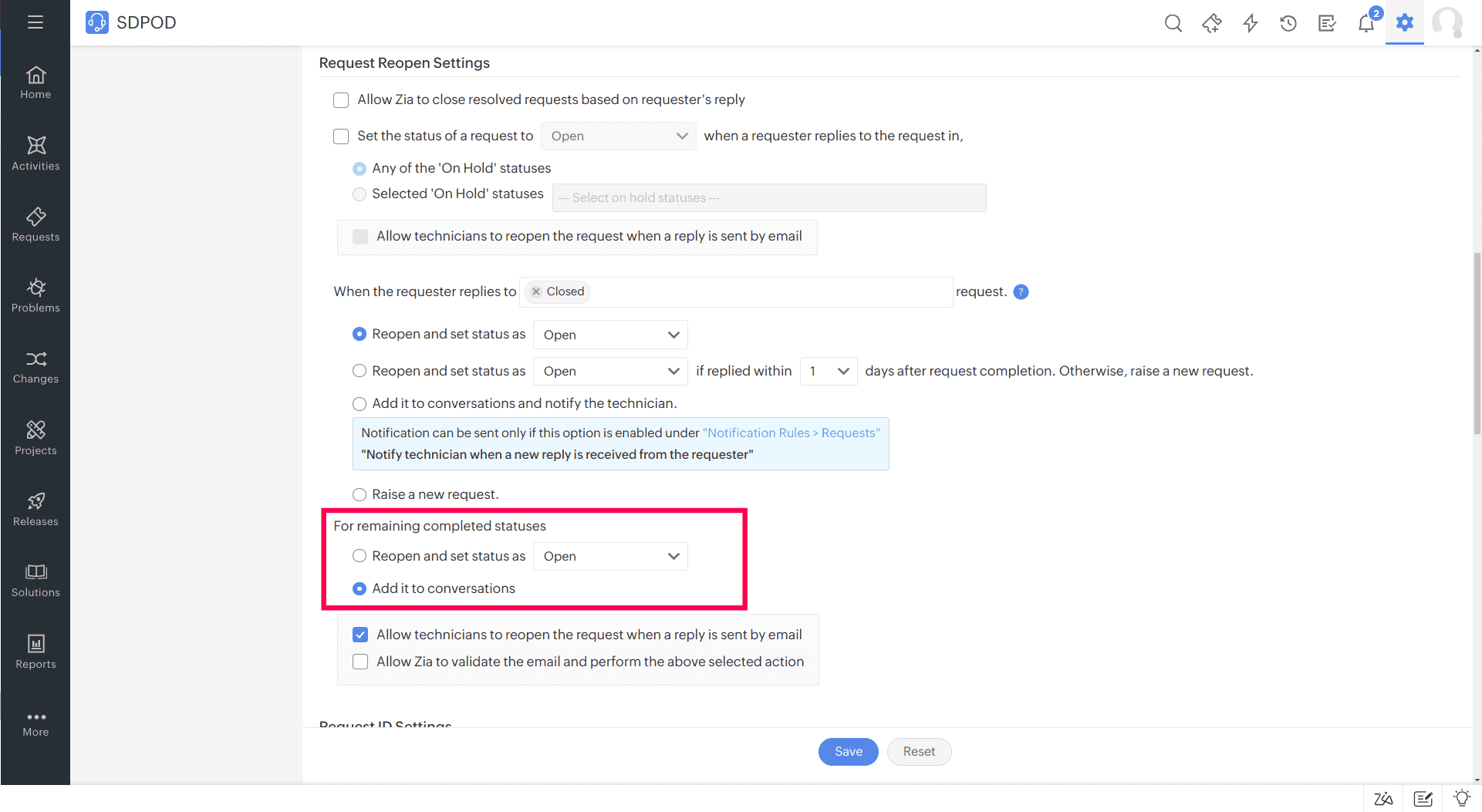 When the requester replies through E-mail to the closed requests you can configure the application to take one of the following: