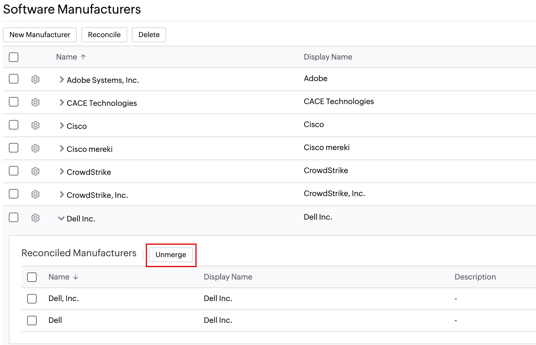 Note: After merging, all associated software, licenses, license types, and license agreements will be moved to the parent manufacturer.