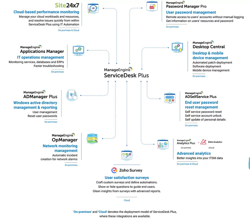 Connect ServiceDesk Plus with the IT and business apps you rely on every day to break down silos and automate workflows. Minimize switching, maximize efficiency, and deliver exceptional service experiences across your digital enterprise.