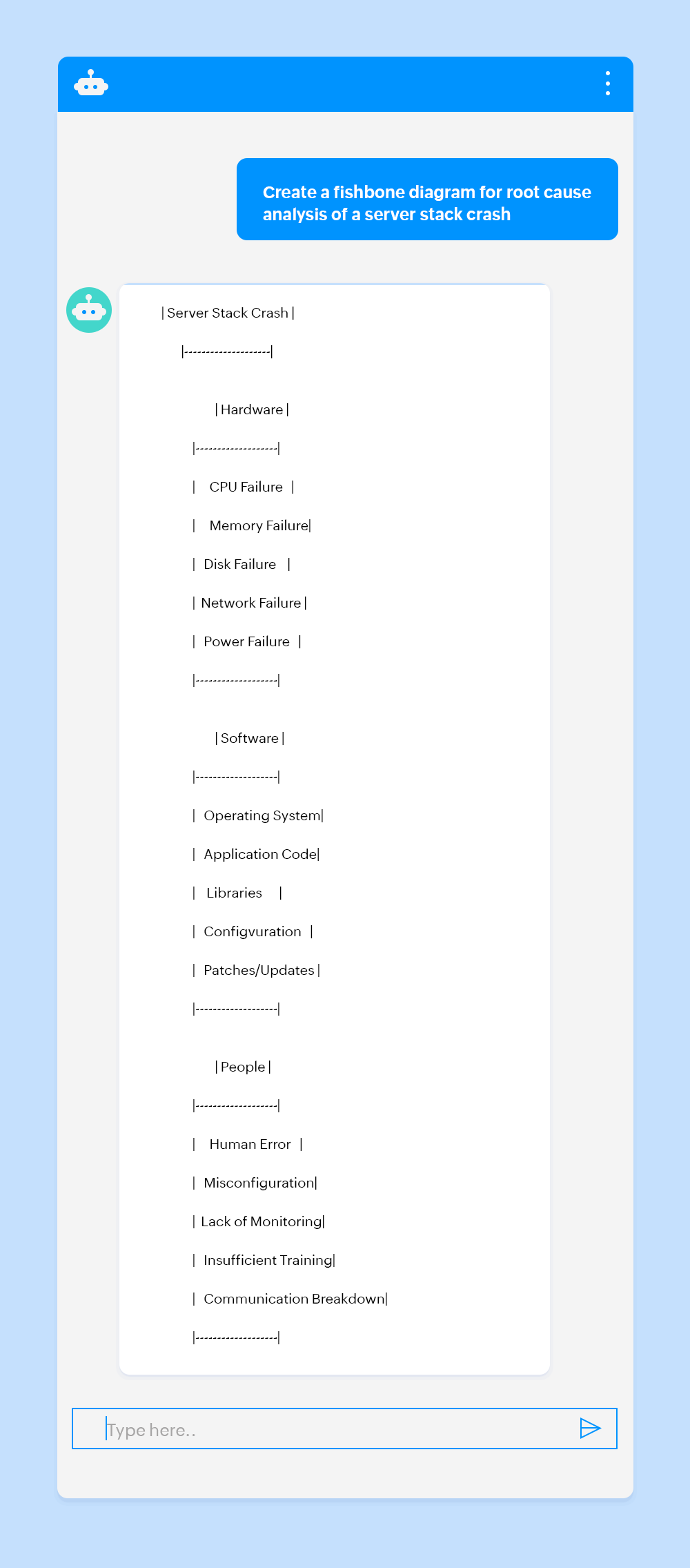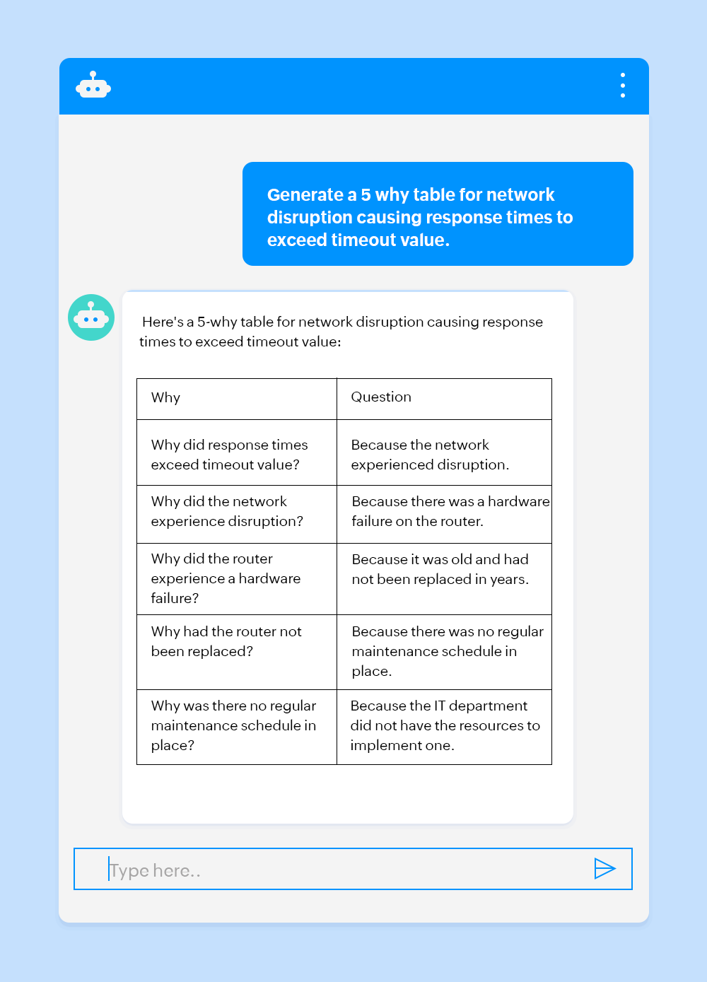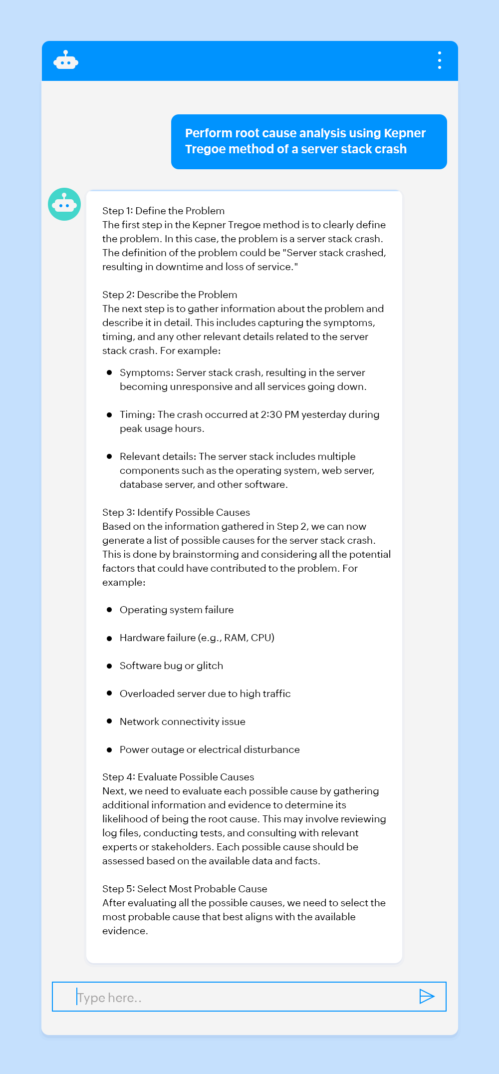 Identifying the root cause of an issue can be a time-consuming and exhaustive process for teams. Service desk teams can leverage ChatGPT to sift through large amount of data to find correlations or anomalies and suggest possible root causes. This frees up time for technicians and shortens the RCA process.