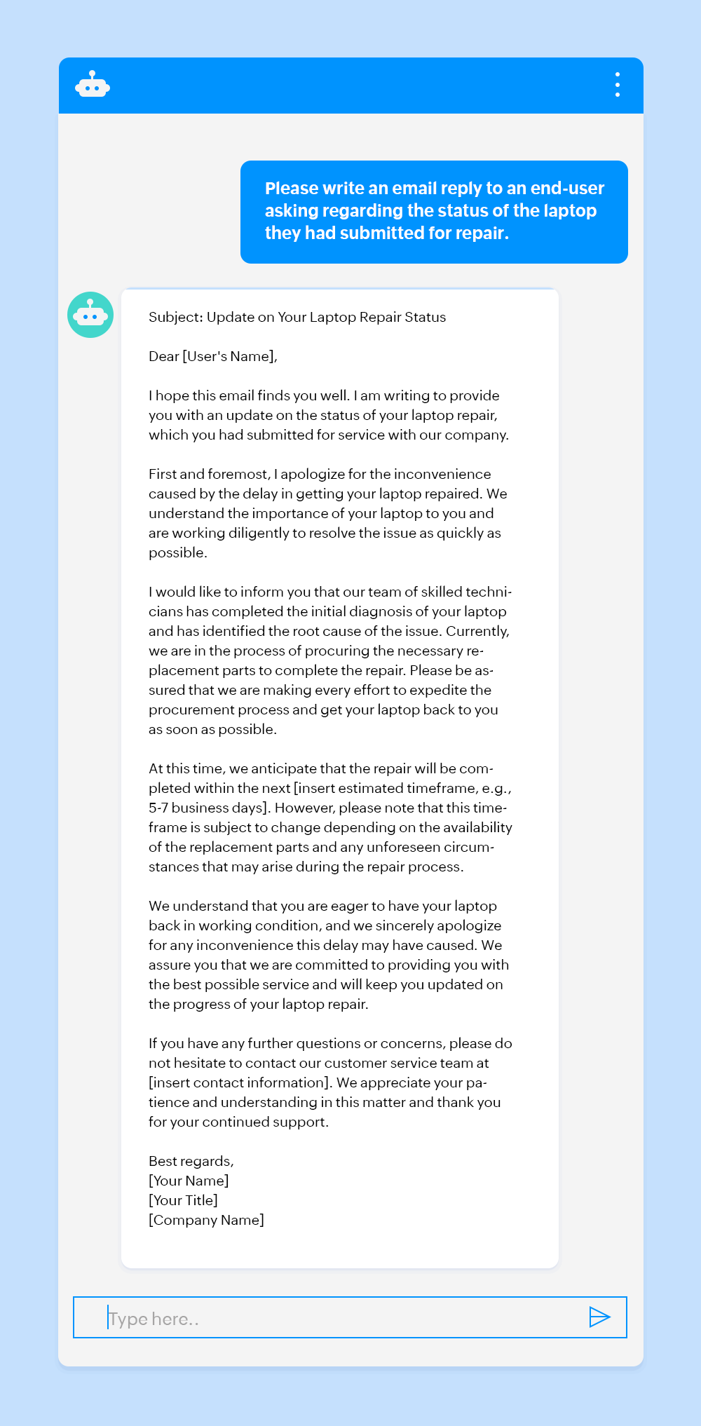 Here is an example of a prompt and response generated by ChatGPT to send to an end user as an email reply regarding the status of their laptop submitted for repair: