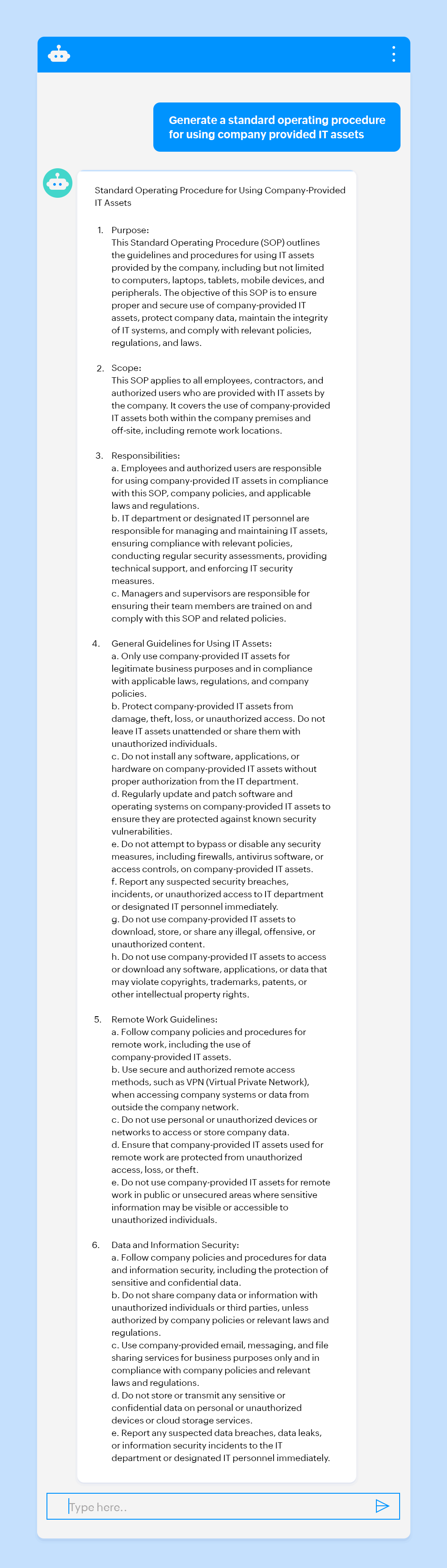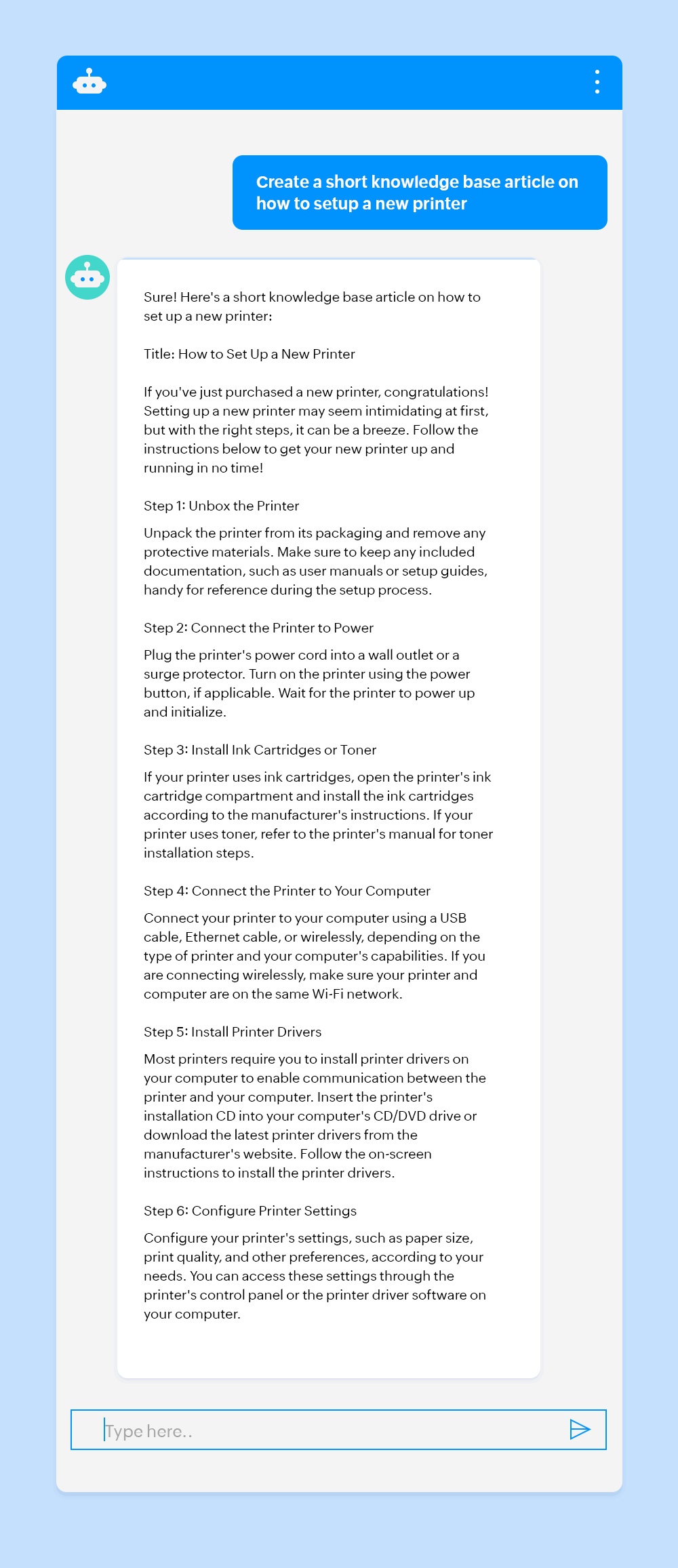 Knowledge base articles form the fundamentals of user self-service help resources because they enable users to find solutions, self-resolve IT issues, and understand procedures quickly. Service desk teams can leverage ChatGPT to generate detailed knowledge base articles which contributes to reducing L1 tickets. ChatGPT can also be utilized by service desk teams to produce detailed procedures for complex processes, such as server stack setup, and LAN issue troubleshooting, as well as to guide technicians to resolutions. The results are frequently fewer reopened tickets.