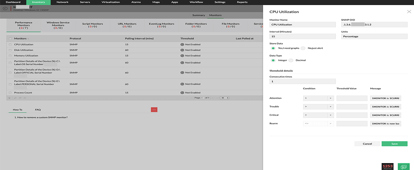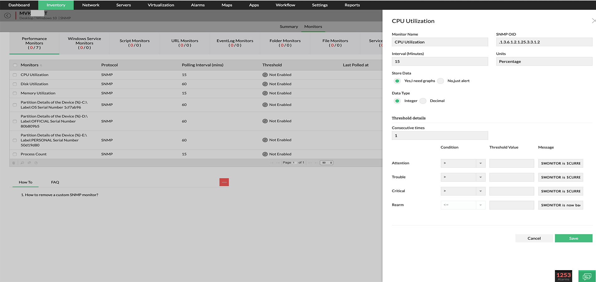 Screenshot zeigt die Erstellung eines benutzerdefinierten SNMP-Monitors der CPU-Auslastung