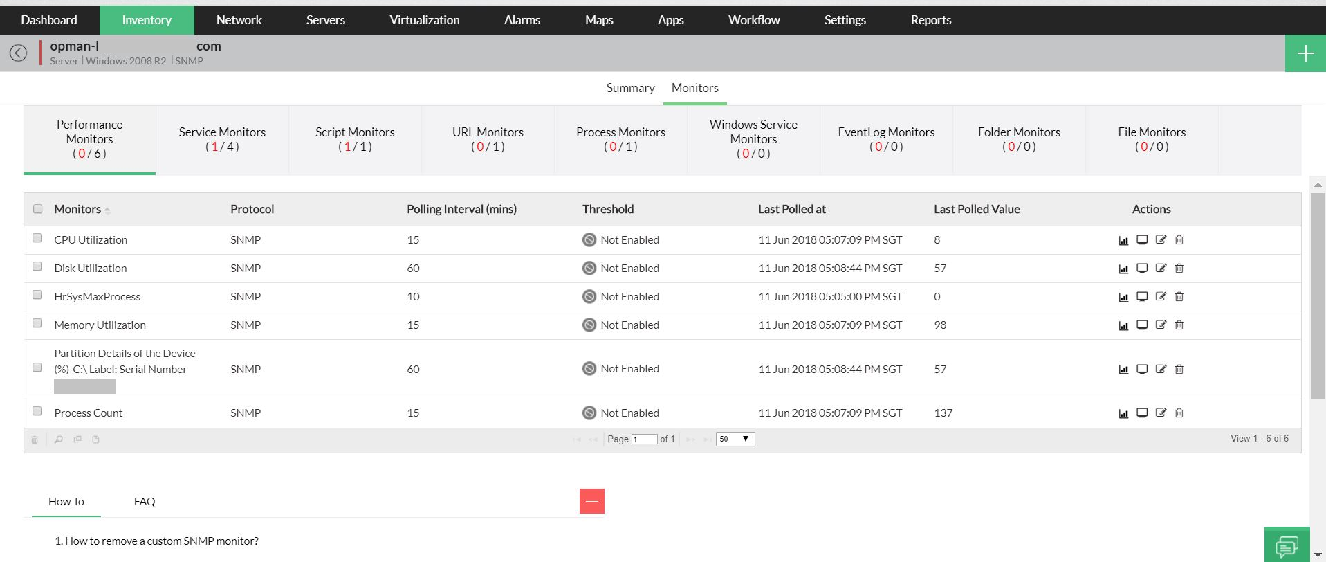 Für Server-Leistungseinbußen sind in der Regel CPU, Arbeitsspeicher oder Festplatten verantwortlich. OpManager überwacht diese Systemressourcen auf Windows- und Unix-basierten Servern und erkennt Leistungsengpässe frühzeitig. OpManager verwendet die Protokolle SNMP, WMI und SSH, um die Host-Ressourcen zu überwachen, und sammelt Leistungsdaten.
