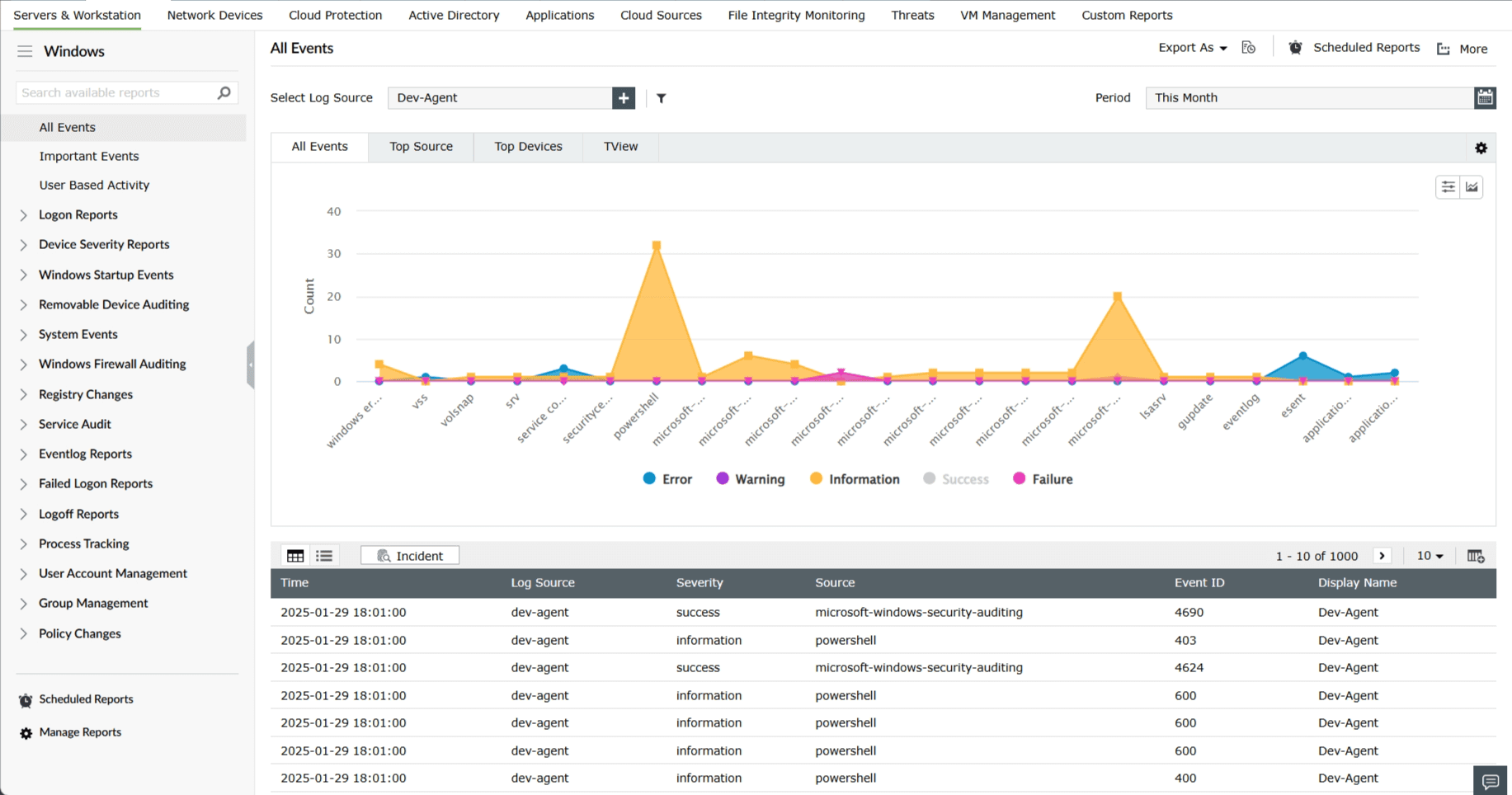 Log360Cloud allows you to create multiple views of the same report. This enables you to view the report based on different parameters such as time, domain, source, etc. The different views will be generated from the same set of log data.