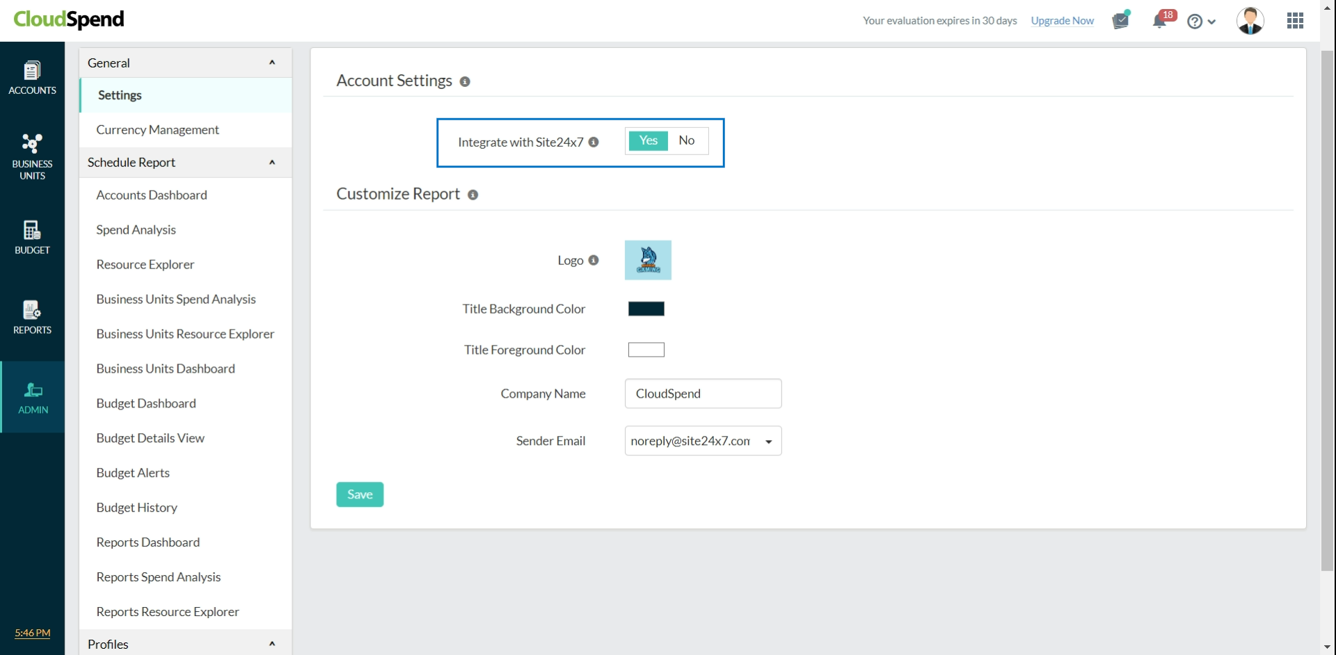 The Settings page in CloudSpend lets you manage key configurations for your account. From here, you can integrate CloudSpend with Site24x7, set how Azure list prices are handled, and customize the way scheduled reports look before they are shared with your team. This page has two sections: Account Settings and Customize Report. Each section is explained below.