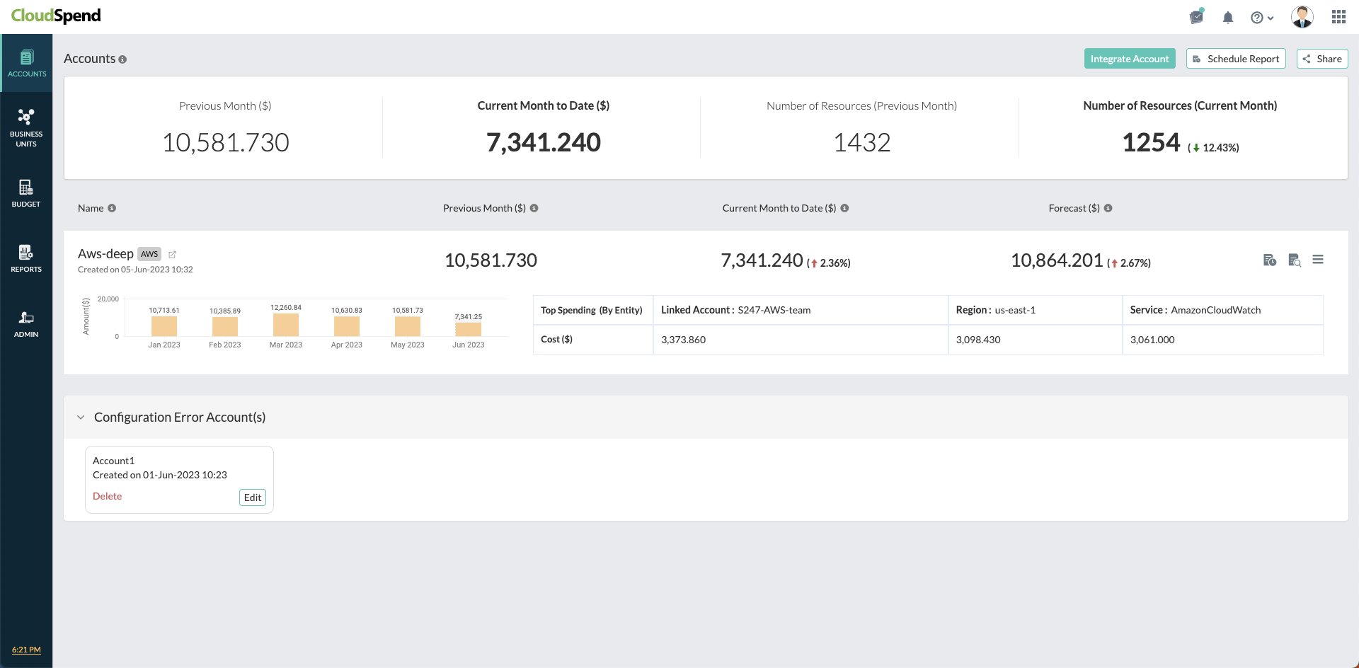 You can now easily view the errors in configuring your CloudSpend account, like Invalid report name or Expired roles in the Configuration Error Account(s) section. Choose to either edit or delete the configuration error and rectify the errors for all accounts from a single view.
