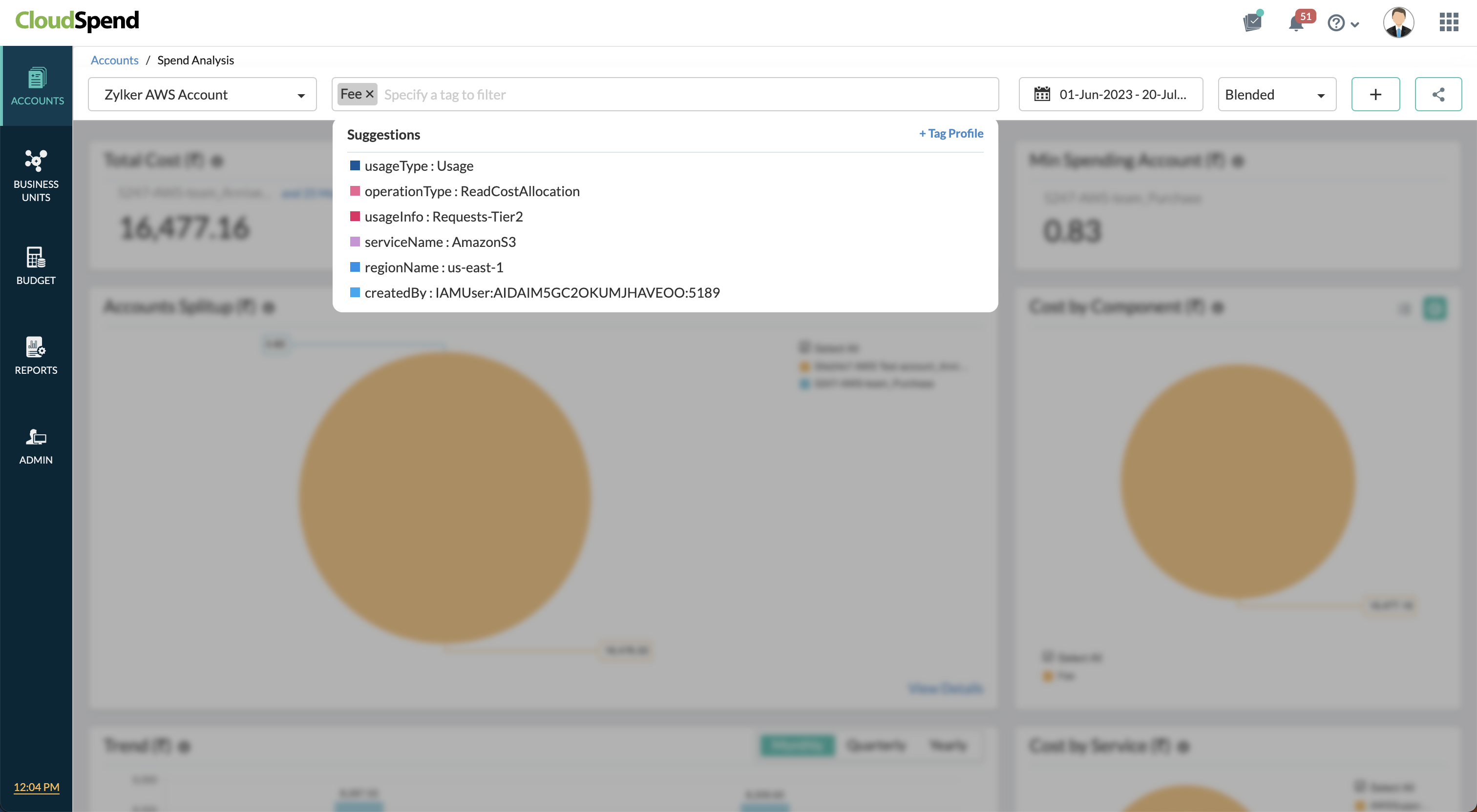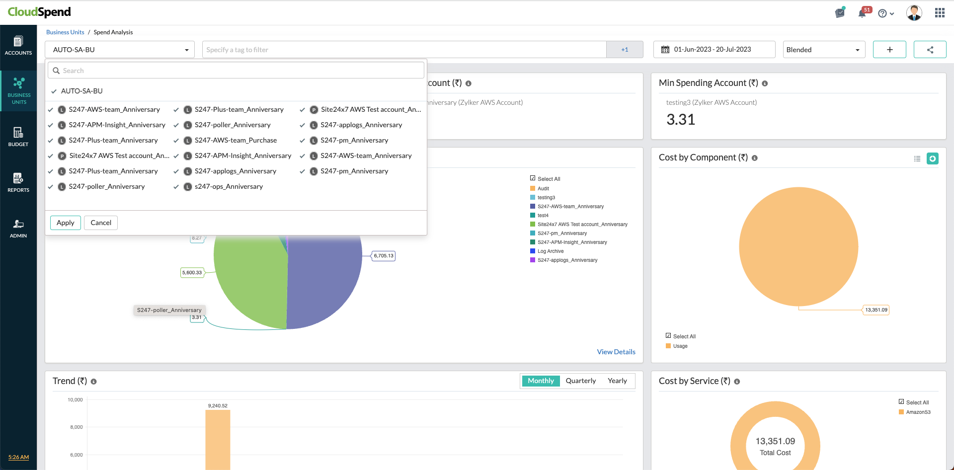 Spend Analysis provides you with information on costs split up by Service, Account, Region, Component, Trend, and Resource. When you select a specific BU from the dashboard as shown in Fig. 1, you'll be taken to the Spend Analysis section of your BU where details on the total cost accrued, the maximum spending account, and the minimum spending account are provided. You can set a custom duration and view the cost data. You can also configure Business Units, Budget, and Schedule Report using the Add button. Learn more about scheduling your cost and usage reports for spend analysis of a BU.