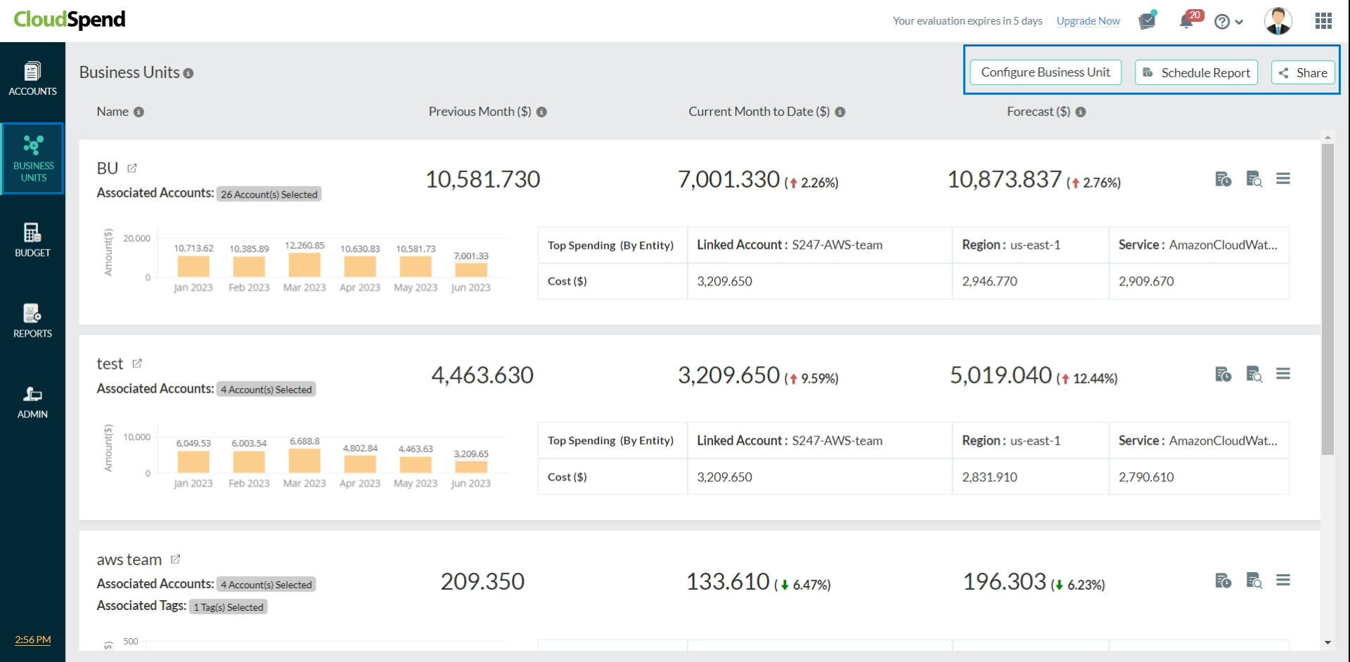 Business Units (BUs) allow one or more accounts to be grouped together, and to be organized in a management hierarchy. Tracking cloud costs across various cost centers using inefficient tools or minimal cost tracking mechanisms tends to delay business decisions between teams. When an organization manages multiple cloud accounts, tracking cloud costs can be a lot of work. If you have a hybrid cloud environment, you can combine and view all your cloud cost data with BUs.