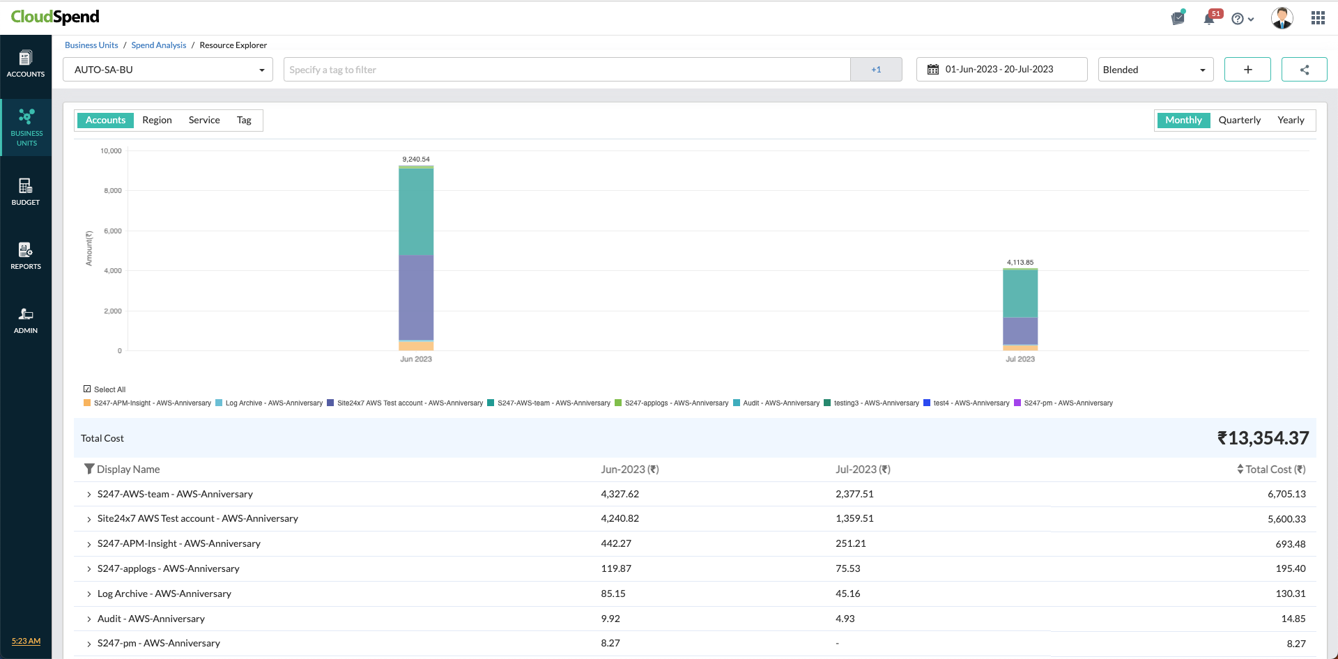 The BU Resource Explorer provides you with an aggregated view of your cloud resources in various categories like Accounts, Region, Service, Resource Group, or Tags for each BU. When you select View Details in the Accounts Splitup view of a specific BU as shown in Fig. 2, you'll be taken to the Resource Explorer section. The granular details of your resource-level spending can be viewed on a daily, monthly, quarterly, or yearly basis, and can be exported as a PDF or emailed immediately. You can set a custom duration and view cost data. You can also configure Business Units, Budget, and Schedule Report using the Add button.